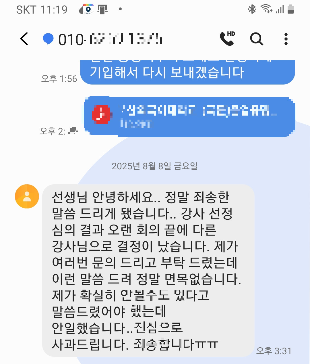 왜 그리 생각하냐면, 정말 죄송하고 송구했다면 적어도 사과의 메시지를 한 두 차례라도 더 보내는 것이 바람직한데, 한 번의 통화 이후 지금까지 그 어떠한 사죄의 의미를 담은 메시지를 받은 적이 없다.
