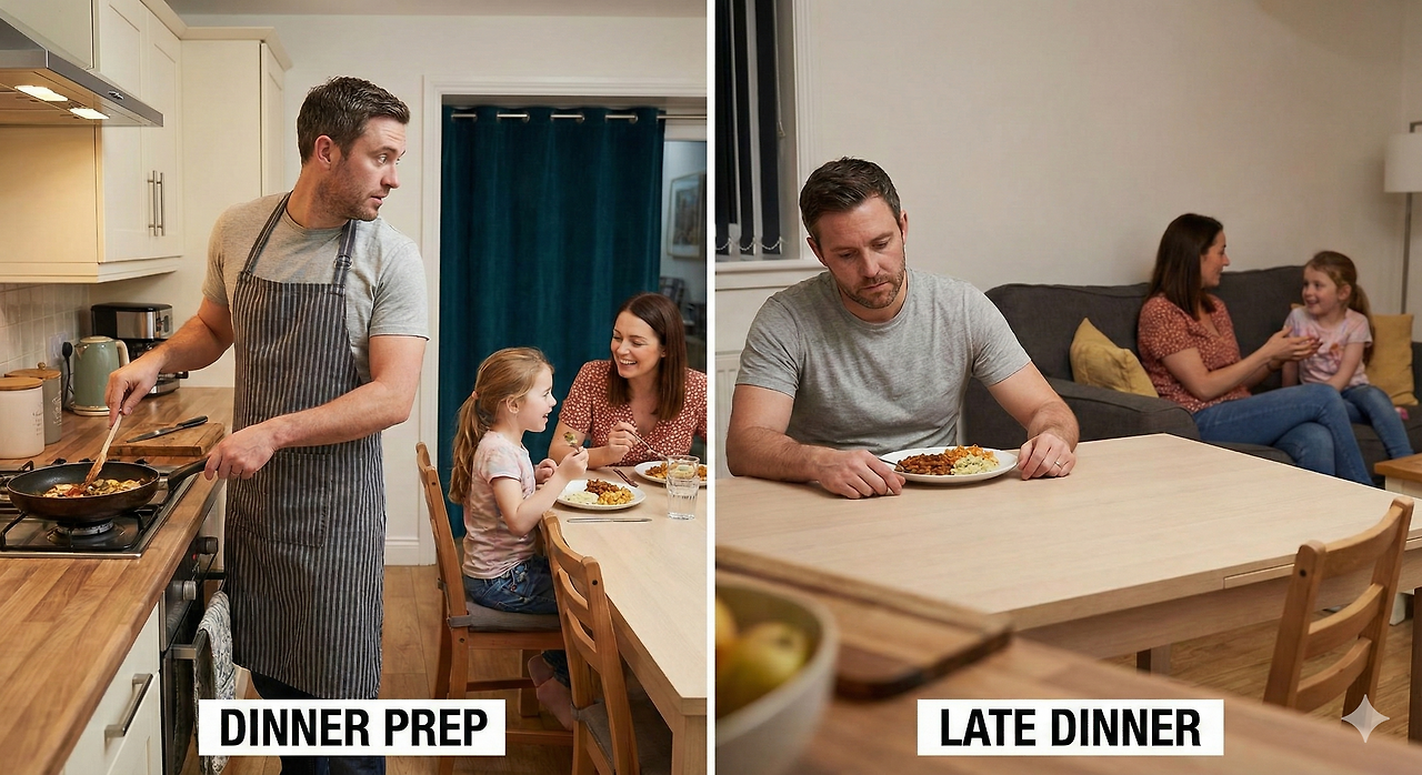 배고프다는 이유로 먼저 먹게 된다. 그리고 먼저 식사를 하는 사람들끼리 소통은 원활해진다. 반면, 요리를 하고 돌아서서 이제야 식사를 하려는 사람은 약간 소외되는 느낌을 받는다. 이런 어색함을 줄여주기 위해서 앉아 있는 아내가 있지만, 때론 오히려 불편감을 느낀다.