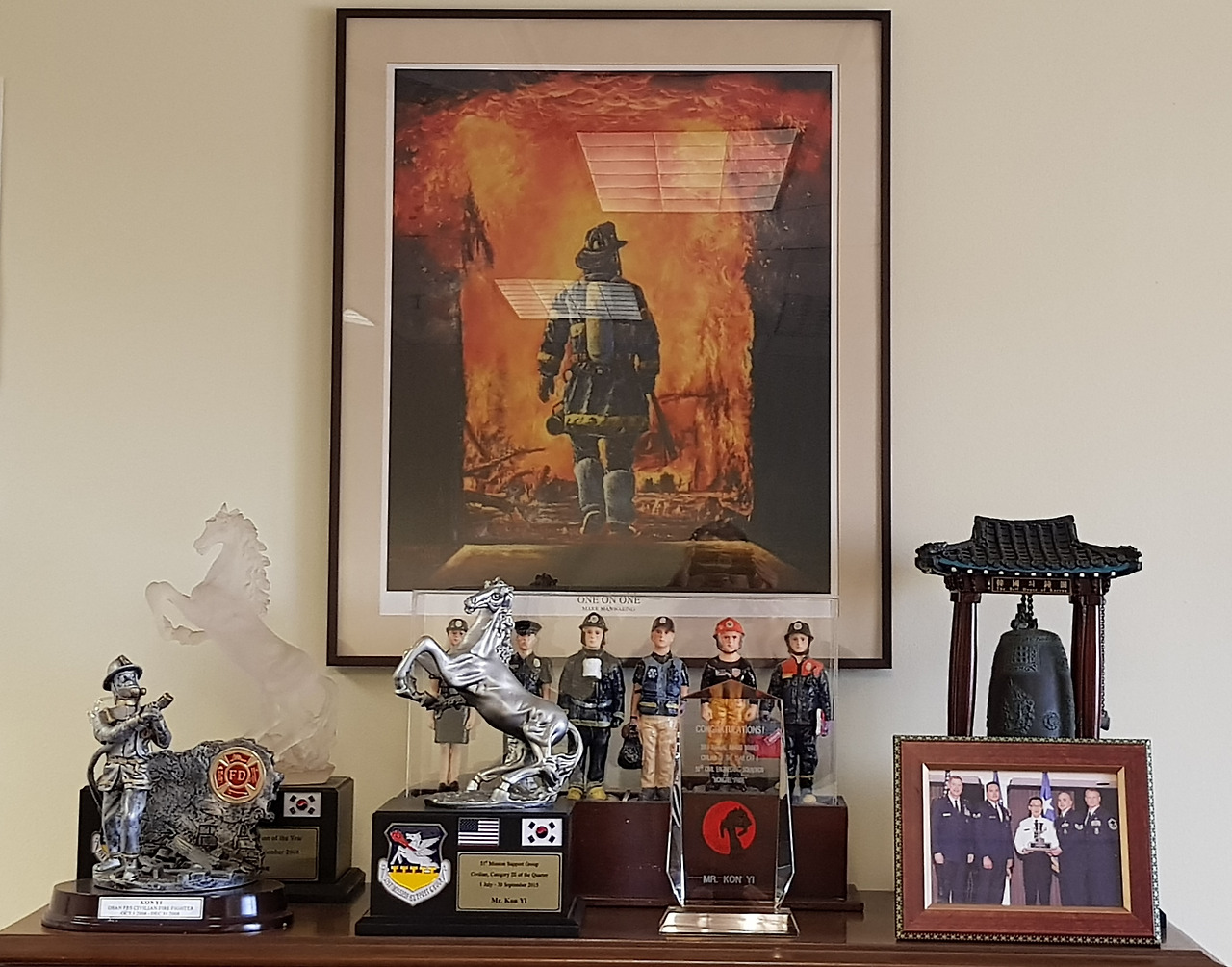 다행히 최근 개업한 후배가 미국 소방대원 모형물이 필요하다고 해서 내 이름표만 떼고 3개의 트로피를 그에게 분양해 주었다. 거기에 지난번 미군 한 명이 짐을 옮기다가 실수로 깨트린 트로피도 공간의 협소함을 일정 부분 해소해 주었다. 연신 미안하다며 어떻게 보상을 해야 하느냐고 물어왔지만 고민을 덜어준 그가 고마웠다. "더 세게 짐을 밀었어도 나쁘진 않았을 텐데..."
