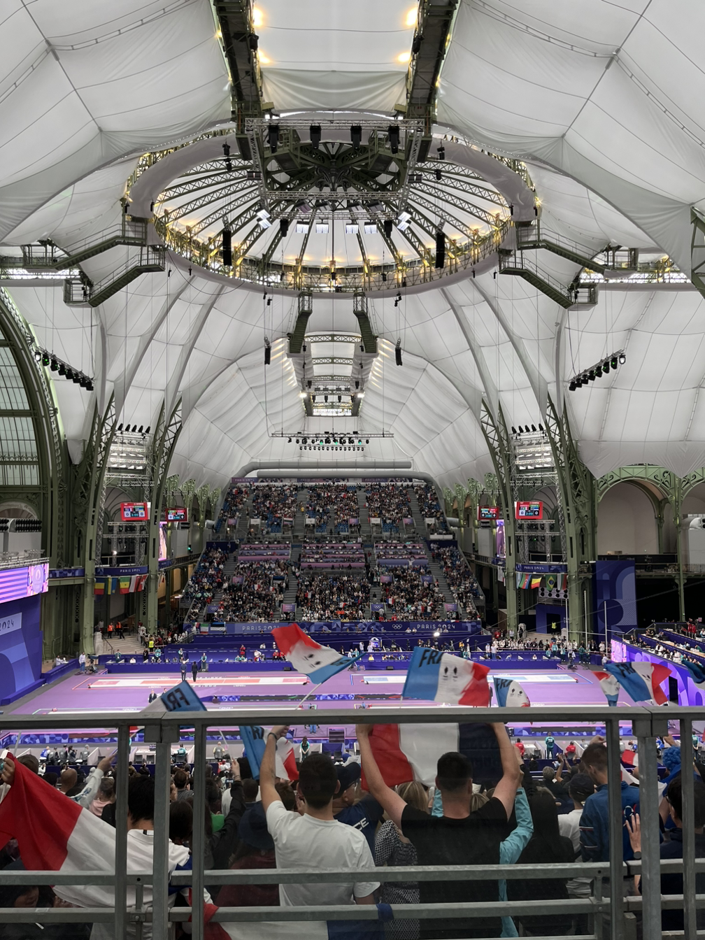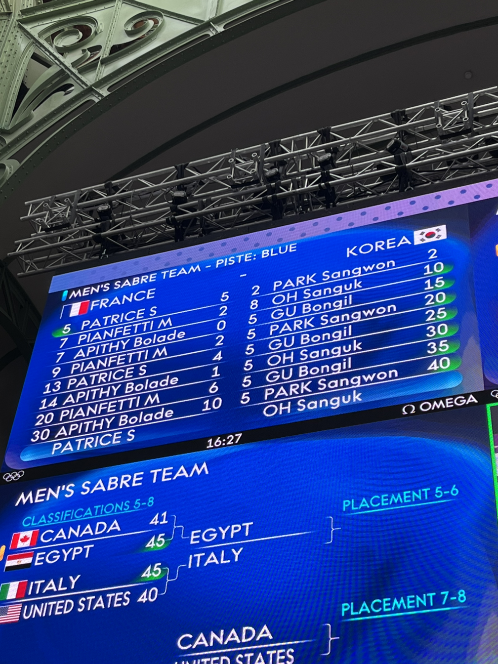 남자 펜싱 에페 단체전에서 종주국 프랑스팀이 선전하고 있다. 관중들은 소리를 낼 수 있는 모든 도구들을 이용해 자신들의 팀을 열광적으로 응원하고 있다.