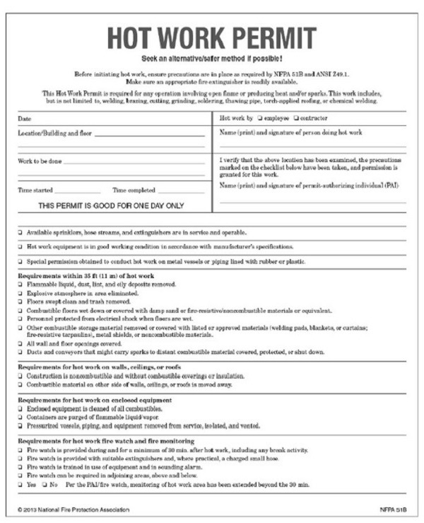 [미국방화협회 기준 51B, 용접 허가증 샘플]