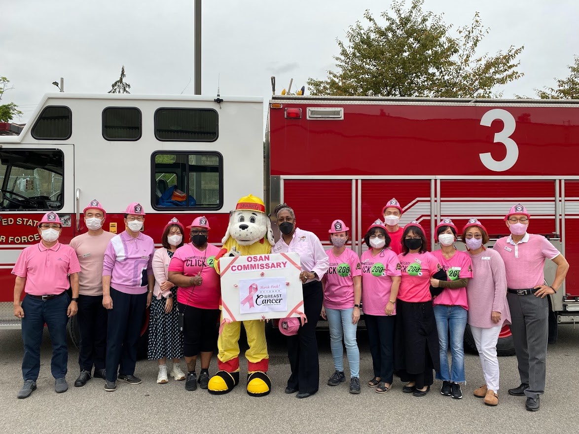 주한 미 공군 오산기지 소방서 소방대원과 마스코트 '스파키(Sparky)'가 <유방암 예방 캠페인>에 참여하고 있다.