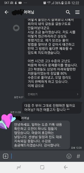 처음에는 비싸다며 수업을 고민하셨던 어머님께서, 이제는 수업료를 먼저 올려주시면서까지 계속 진행 해달라고 말씀하십니다. 그 이유는 '달랐기 때문' 이 아닐까 합니다. 지금까지 겪어보신 교육서비스들과는 다르게 느끼셨나봅니다.