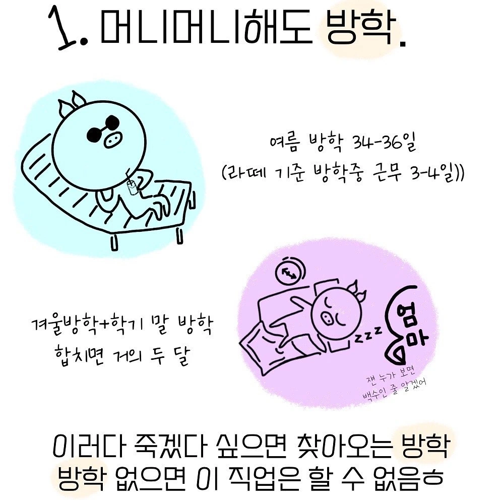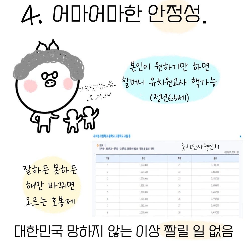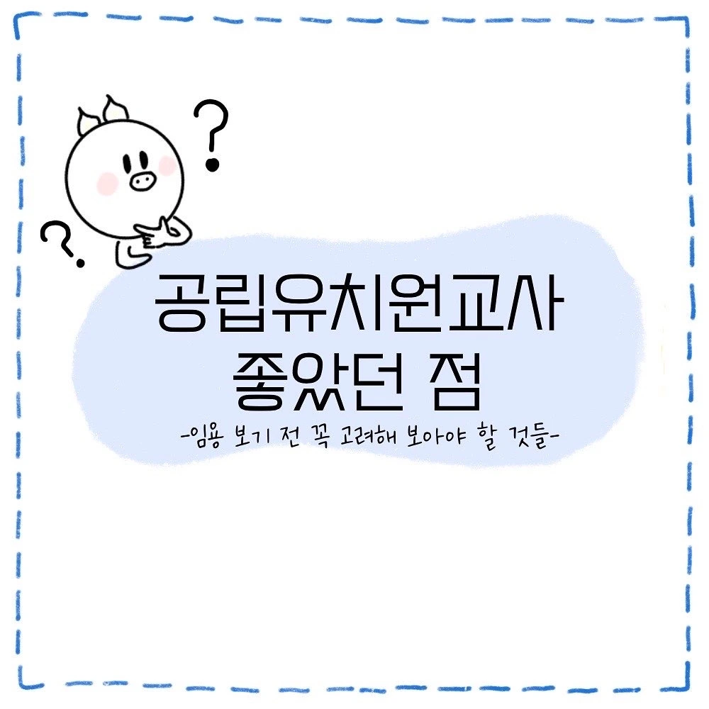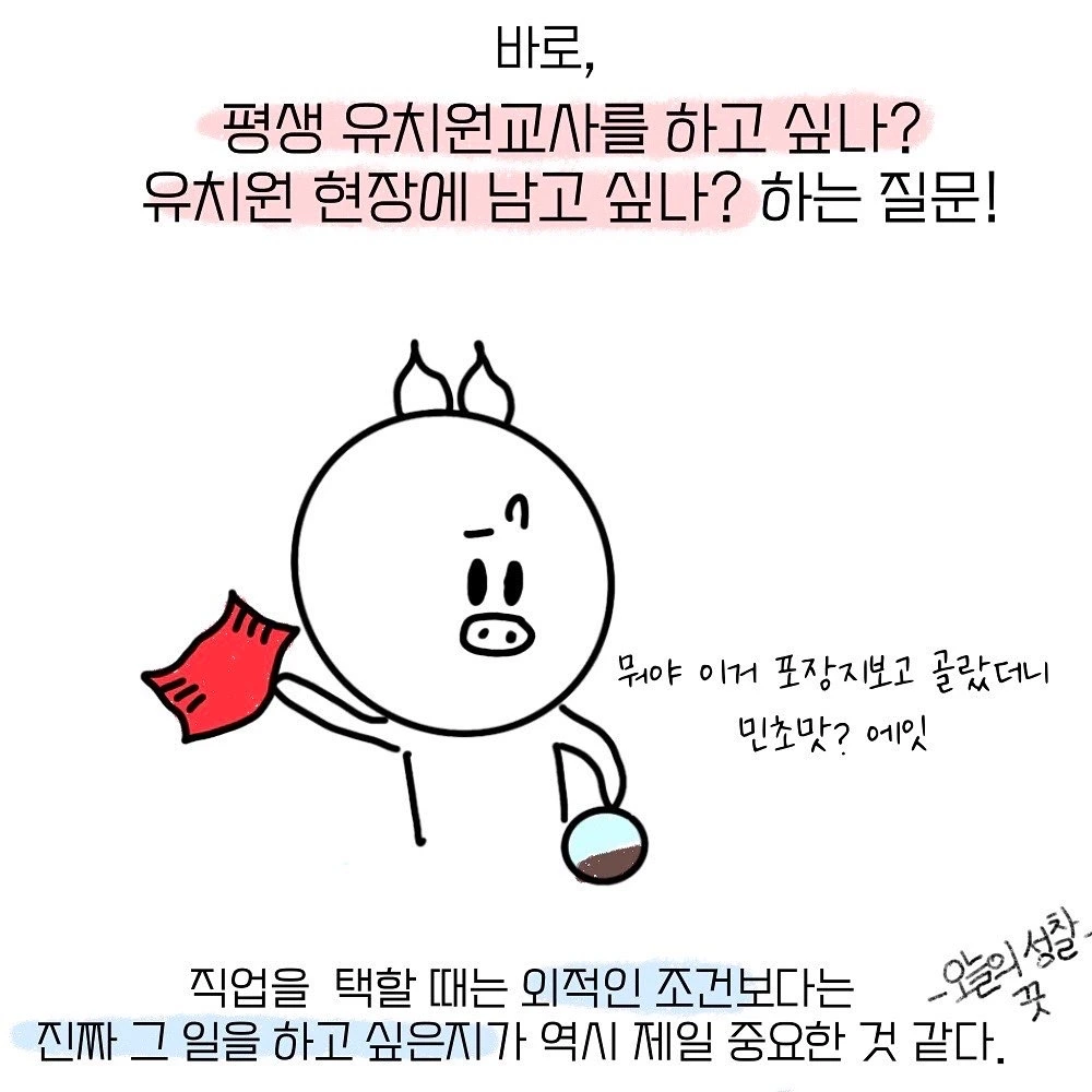 공립유치원교사는 잘 모르는 경우가 많지만 좋은 직업이다. 초중등교사와 같은 준7급 교육공무원이고, 안정성과 방학, 이른퇴근시간, 각종 수당과 호봉제, 휴직제도 등등. 아이들을 좋아해서 유아교육과에 간것도 맞지만, 임용고시를 본 이유는 그런 외부적인 요인들이 매력적이라고 생각했기 때문이었다. 그러나 유아임용을 보기 전 가장 중요하게 고려해야 할 것은 그것이다.
