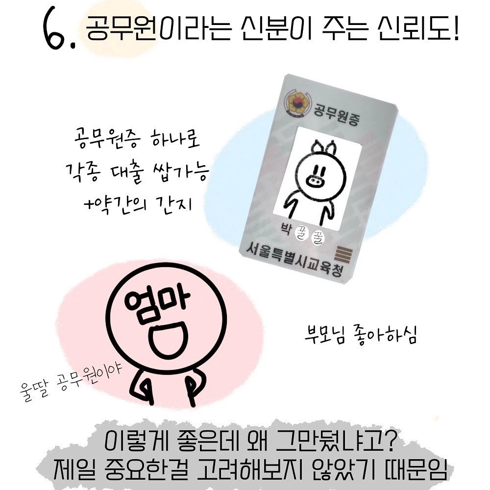 유아임용을 준비하고 합격한 후에는 일단 그만두기 어렵다. 내가 이 시험을 준비하며 얼마나 고생했는지가 자꾸 떠오르고, 공무원이라는 메리트를 포기하기가 정말 어려운데다 몇년 경력이 쌓이고 나면 아깝다는 생각과 한편으로는 그만두고 무슨 일을 할수있을지 감조차 잡히지 않기 때문이다.