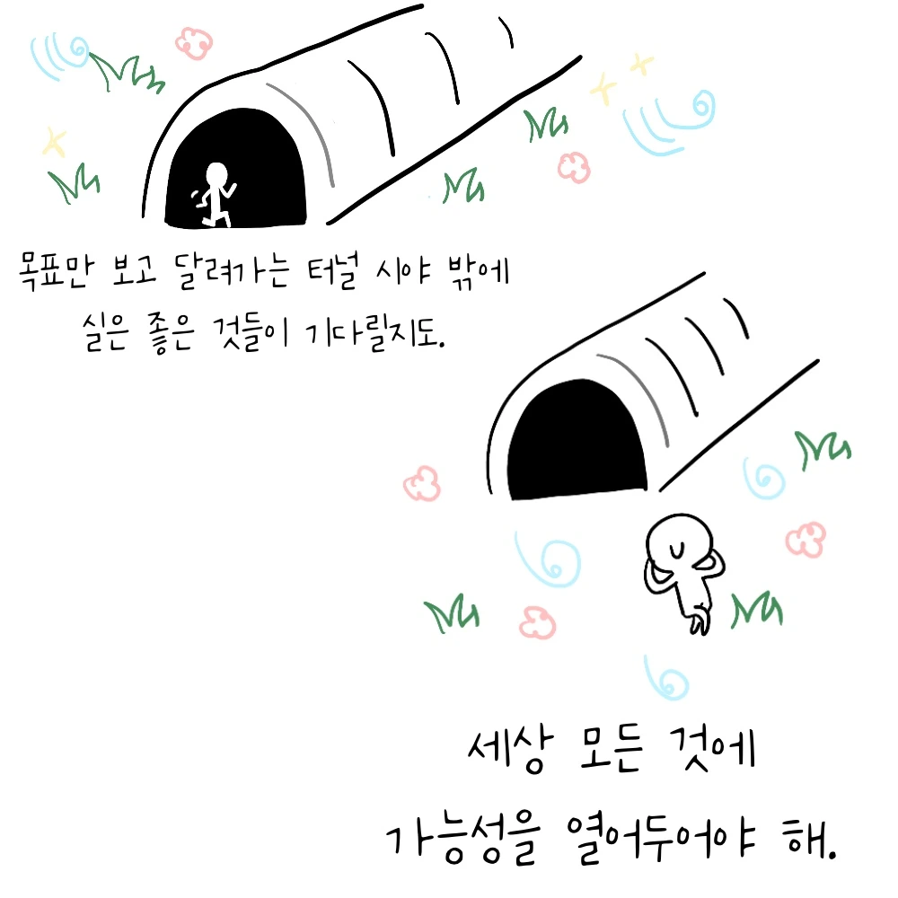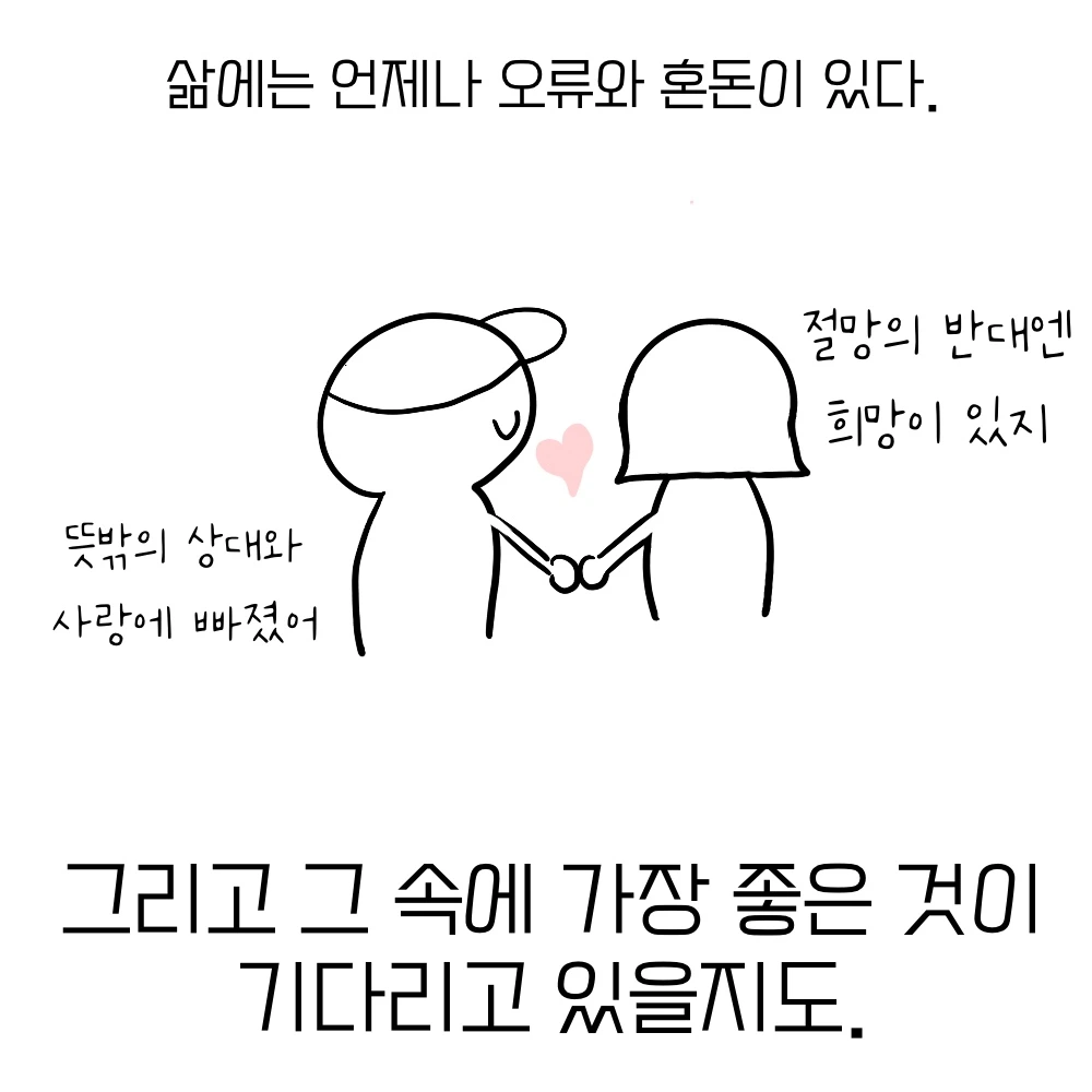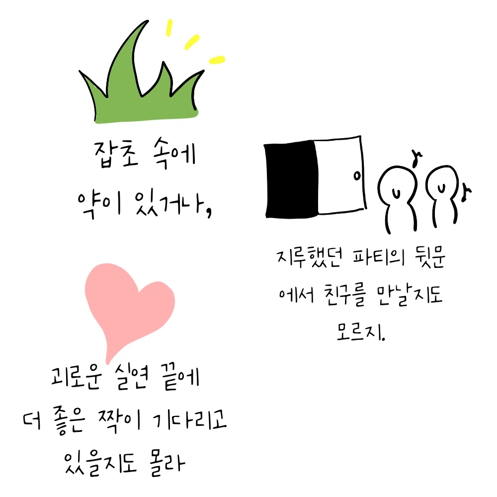 가장 중요한 것은 혼돈에 빠졌다고 너무 좌절하지 않는 것이다. 혼돈으로 보이는 것들 속에 실은 가장 좋은 것이 숨겨져있을지도 모르니까. 돌이켜보면 나는 내 인생에서 혼돈으로부터 빠져나오려고 노력하던 모든 시기들을 지나며 더 단단한 사람이 되었다. 그리고 혼돈에 빠진 나를 구제해주던 주변사람들을 보며 사람들을 더욱 사랑하게 되었다.