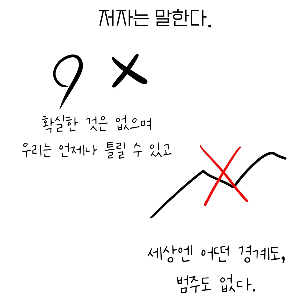 그러한 그물망을 함부로 파괴하지 않기 위해서 우리는 매일 조금 더 진보해야 한다. 진보를 향해 나아가는 것은 모든 것에는 오류가능성이 있다는 점을 받아들이고 나아가는 것이다. 함부로 어떤 대상의 부적합함을 단정지어서도 안된다. 적합성을 기준으로 판단할때 부적합하고 결점이 있어보이는 것들이 시간이나 상황에 따라 적합해질수도 있다. 내가 정말 싫어하는 작은 거미조차도 나보다 더 자연에 기여하고 있는 생물일 수 있다는 것을 인정해야 한다. 내게 함부로 판단하고 제거하고 단죄할 수 있는 권리는 없다. 즉, 다른 이들의 그물망을 파괴할 권리는 누구에게도 없는 것이다.