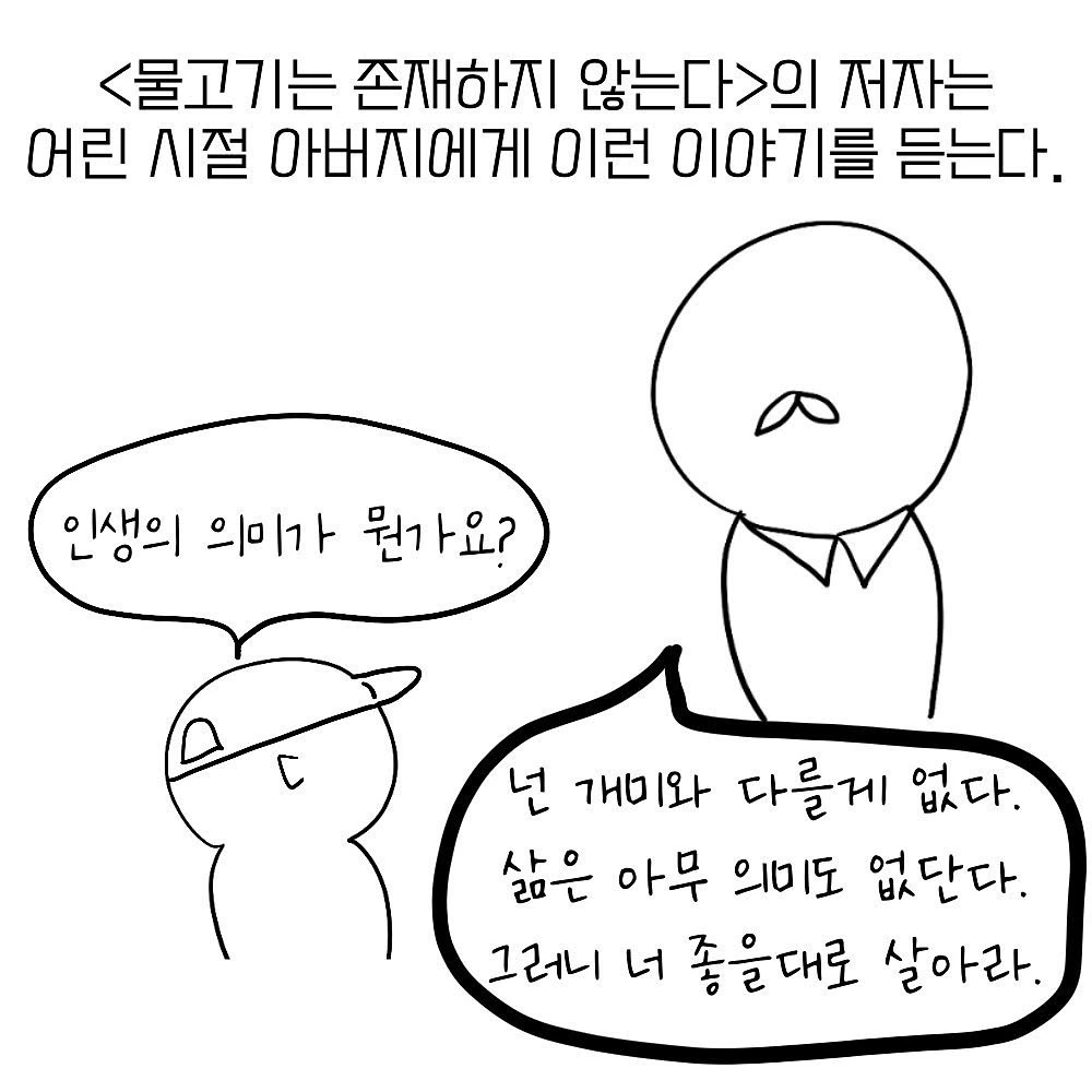 인생은 사실 아무 의미가 없다. 인간이 다른 생물에 비해 자연이나 이 세계에 중요한 존재는 아니다. 그래서 사람들은 삶의 의미를 찾지 못해 혼돈에 빠지기도 하지만, 실은 우리는 아주 아주 중요하다고 <물고기는 존재하지 않는다>의 저자는 이야기한다. 우리는 서로와 촘촘히 연결된 그물망안에서, 다른 이의 삶을 유지시켜주기도 하고 누군가에겐 삶의 이유가 되기도 한다. 그 관계 안에 답이 있다. 우리는 서로에게 중요한 존재들이다.