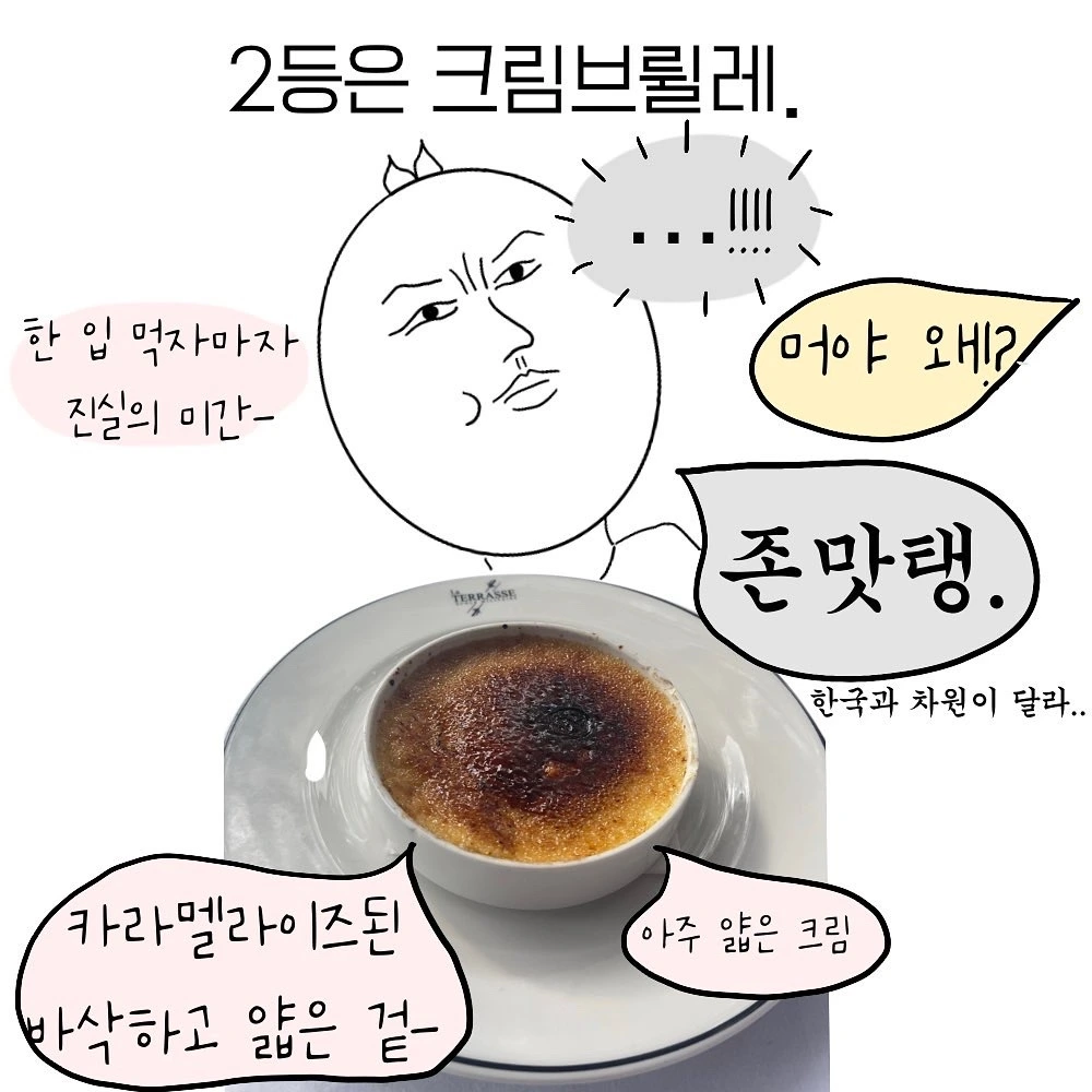 크림브륄레를 처음 들어본건 영화<리틀포레스트>에서 였다. ‘기분이 우울한 날엔 크림브륄레’ 였던가. 문소리 배우가 어린 딸에게 만들어준 크림브륄레가 기억에 남아 한국에서도 여러번 사먹었다. 겉은 토치로 구워 설탕이 녹아 굳어져 바삭바삭하고, 속은 바닐라향이 나는 진한 크림이 있어 숟가락으로 떠먹는 디저트. 나는 파리에서 마지막날, 사치를 좀 부려보고자 에펠탑 앞의 레스토랑에 가서 이걸 시켰다. 그리고 한입 먹는 순간 나는 느꼈다. 이제까지 내가 먹은 크림브륄레는 다 거짓이고 이게 참이라고. 역시나 한국에서 먹던 것보다 크림층이 얇았는데, 양이 적은 대신 아주 감미롭고 진한 크림이 입안에 진하게 맴돈다.