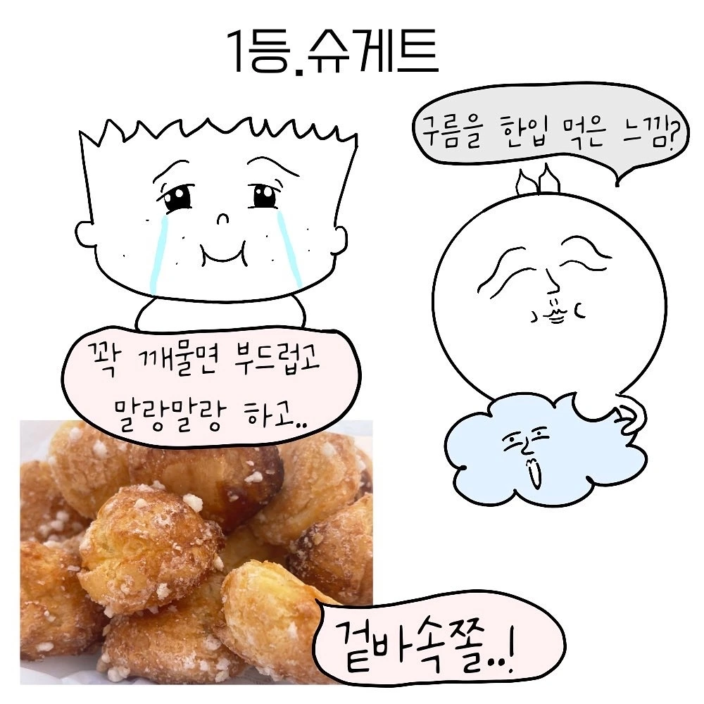 말하기만 해도 침이 고인다. 슈게트는 아마도 슈크림빵+바게트를 합친 이름 같다.(추측) 겉은 슈크림빵같이 부드러운데 조금 더 바삭하고, 속은 크림은 없고 쫄깃한 바게트빵같은데 살짝 비어있어서 깨찰빵의 속같기도 하다. 슈게트를 1위로 정한 이유는 일단 한국에 돌아가면 먹기 힘드니까. 그리고 마카롱이나 다른 디저트는 느끼하고 달아서 2-3개 이상 먹기 힘든데 슈게트는 마치 뻥튀기과자처럼 끝없이 들어간다. 20개씩 사서 10개는 먹고, 10개는 들고다니면서 출출할때마다 먹었다. 부드러운 식감과 달콤바삭한 겉부분의 조화가 완벽하다. 구름을 한조각 떼어서 먹어볼 수 있다면 바로 이런 맛일까? 다른건 몰라도 이 슈게트 하나만큼은 정말 다시 먹으러 가고싶다.
