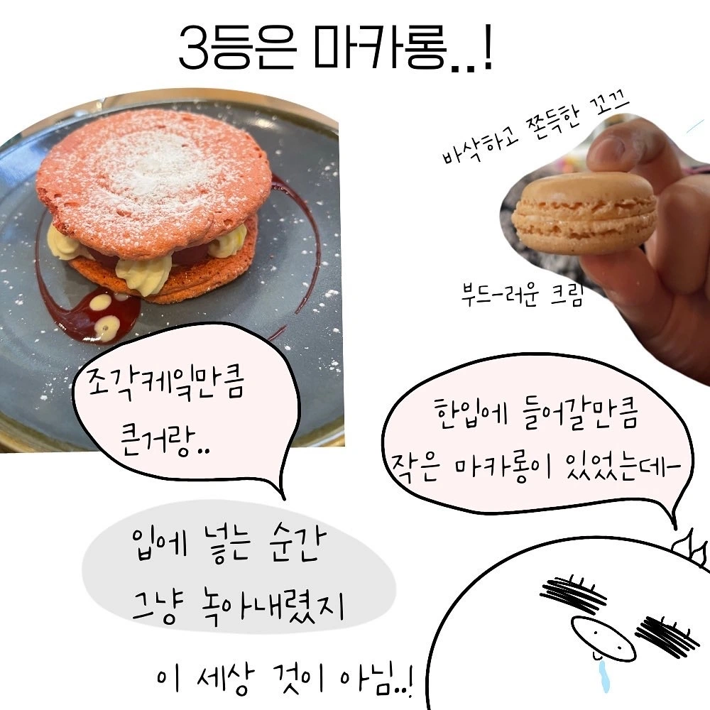 파리여행 둘째날, 마카롱을 한 입 먹고 나는 감탄을 내뱉었다. 한국에서도 마카롱은 자주 사먹지만, 이건 차원이 다르다. 바삭한 식감이지만 쫄깃하고 부드럽게 씹히는 꼬끄, 부드럽고 느끼하지 않은 크림. 마카롱은 두 종류가 있었는데, 조각케잌처럼 큰 것과 한입에도 쏙 들어갈만큼 작은 크기의 마카롱이 있었다. 큰 것은 큰대로, 작은 것은 작은대로 맛있다.
