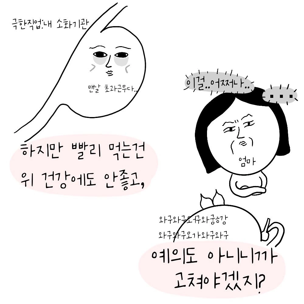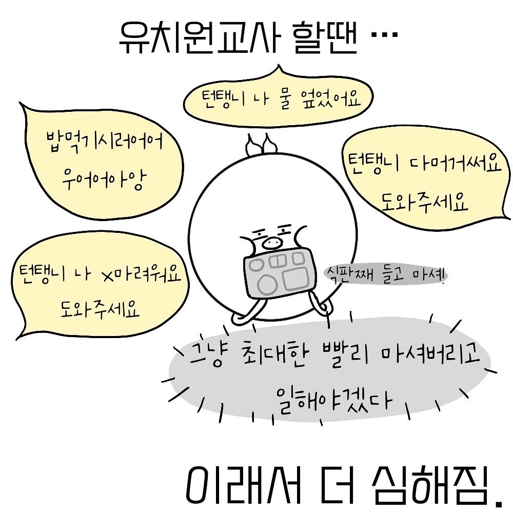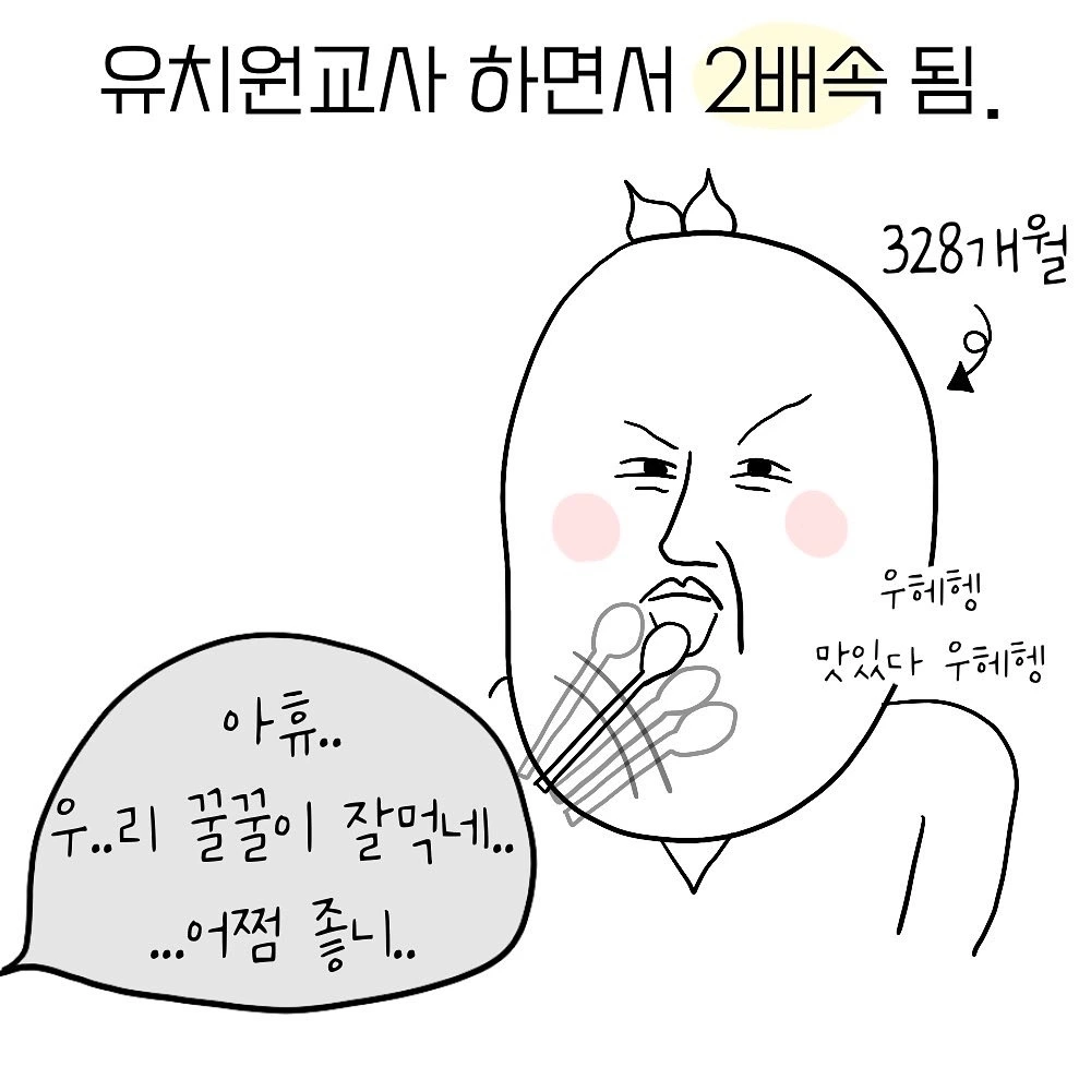 요즘 다른 사람과의 식사시간에 내가 먼저 먹고 기다리는 시간이 신경쓰이기 시작했다. 청소년기에도 밥먹는 속도가 빨라서 엄마에게 그토록 잔소리를 듣고 고쳤는데 왜 또 빨라졌지? 생각해볼 것도 없이 유치원에서의 식사시간이 떠오른다. 아이들의 끝없는 부름과 요청에 도저히 앉아서 10분이상 밥을 먹을 수 없는 그런 환경. 속이 안좋은 아이가 먹다가 토을 하거나, 화장실에 간다거나, 혹은 밥이나 반찬을 더달라거나 옆의 아이와 싸웠다거나 밥먹기가 싫어 운다거나 아니면 그 모든 경우의 수가 한번에 일어날 수도 있다. 그러니 교사는 5-6분안에 식사를 끝내고 일하는 것이 낫다보니 식사를 마시듯이 빠르게 하는것이 습관이 되는 것이다.