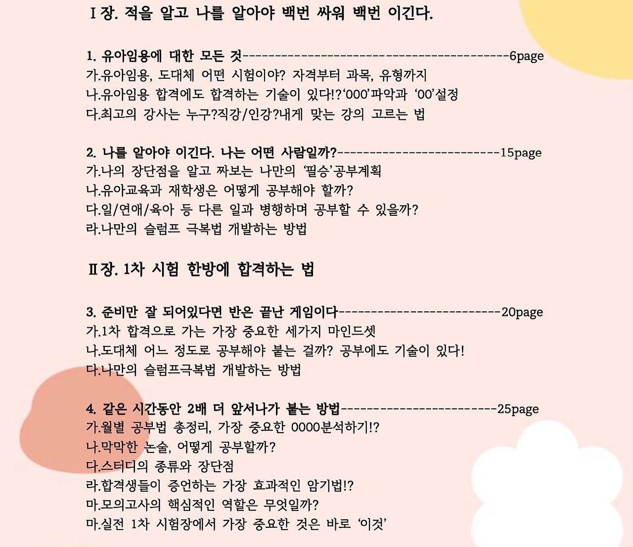 책은 총 1,2차 시험편으로 나누어져 있습니다. 위 책은 1차 시험 편으로, 유아임용에 대한 정보들, 자격, 공부방법, 강사선택법, 암기법, 시기별 공부방법, 마인드셋, 슬럼프극복법 등 여러가지 내용이 담겨 있습니다.