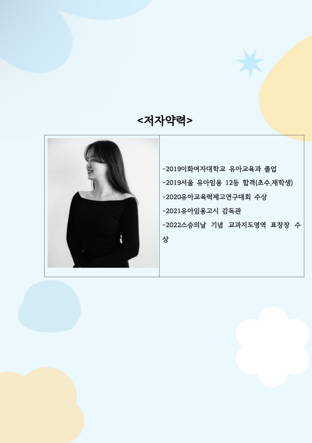 저는 이화여자대학교 유아교육과를 졸업해 서울유아임용에 재학생, 초수로 상위 7%내 점수로 삽격했고 국공립유치원교사생활을 3년간 하며 연구대회수상 및 표창장을 받는 등 유아교육에 관한 경력이 있습니다. 2차시험에서 거의 만점에 가까운 점수를 받았으며 교사를 하며 쌓은 수업노하우와 면접만능답안 자료, 스터디 꾸리는 법, 시기별 공부가이드라인, 마인드셋, 시험장에서 주의해야 할 점 등 여러가지 자료와 내용이 담겨 있습니다.