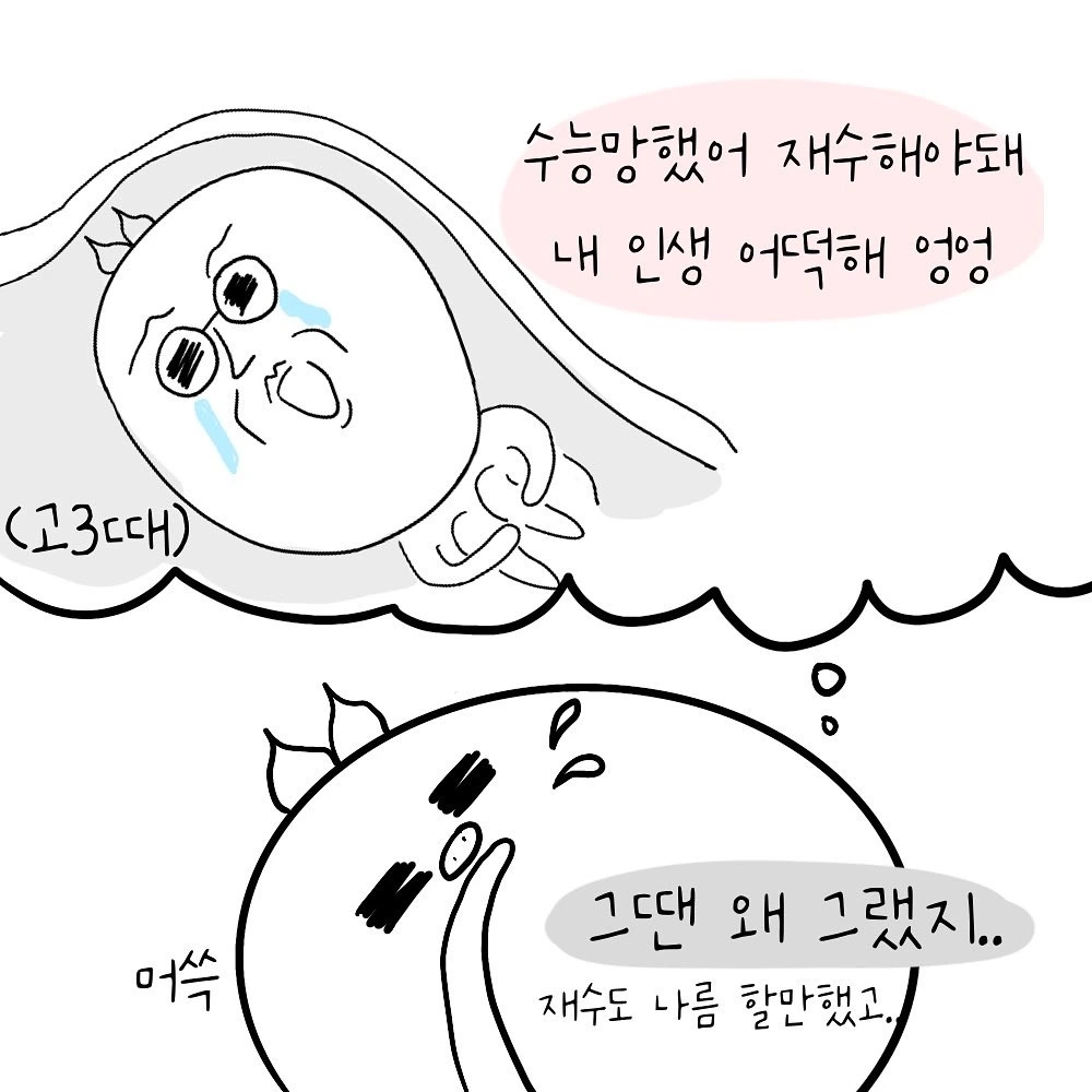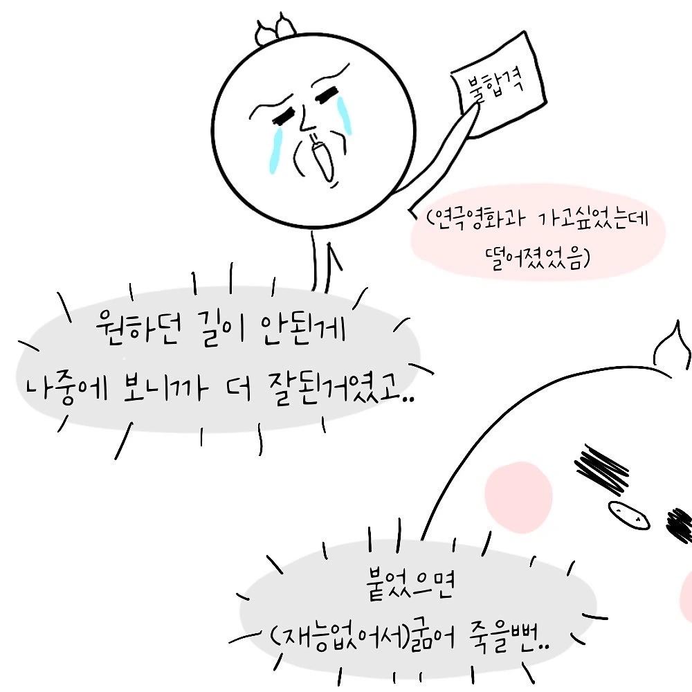 게다가 고3때 대학에 전부 떨어진 덕에 재수를 할수 있었고 재수를 한 덕에 원하던 대학에 왔다고 생각했다. 그러나 나는 그토록 원하던 학교에서 전공이 맞지 않아 또다시 힘겨운 시간을 보내야 했다. 이후 원하던 임용고시까지 합격해 기뻤지만 결국 행복하지 않았다.