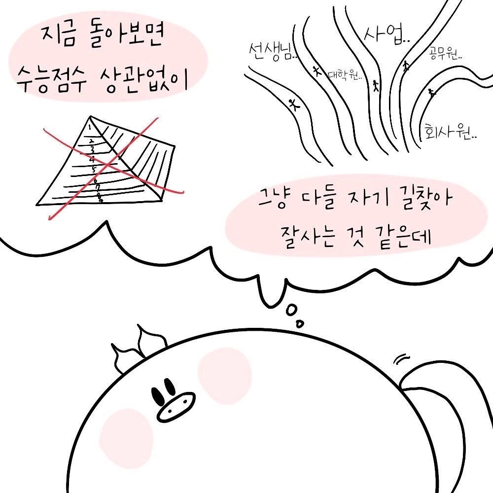 그러니 수능에 그렇게까지 목을 맬 필요가 없었던 것 같다. 이제와 주변을 둘러보면 수능을 잘보든 못보든, 점수에 상관없이 당차게 자기 사업을 하기도, 전혀 다른 전공과 학교로 편입을 하기도, 공무원 시험을 보기도, 회사에 취직하기도 한다. 음대를 나와 개발자가 되고, 배우출신이 선생님이 되는 것도 보았다. 그저 모두들 자기 배에 올라타 자신이 가고싶은 방향으로 열심히 노를 저으며 살아가는 것이다. 생각해보면 어차피 수능점수란 상대적인 것이라 잘본 기준도, 못본 기준도 다 제각각이다. 그러니 잠시 구덩이에 빠졌다는 생각이 들어도 웃으며 에라 잘됐다, 하고 내친김에 누워 낮잠이나 자자 하고 누워버리면 그만이지 않을까. 그리고 어느 길로 갈까 고민도 해보다가, 떠날 때가 되면 비축해둔 힘으로 힘차게 구덩이를 빠져나와 걸어나가면 된다. 그저 웃으면서 씩씩하게 걸어나가며 살면 그뿐인 것 같다고 생각하는 요즘이다.