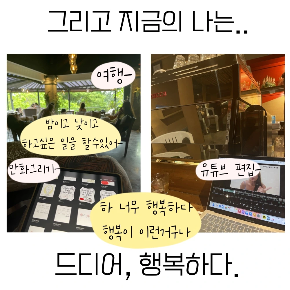 지금의 나는 물론 행복하다. 우붓에서 나는 만화를 그리고, 글을 쓰고, 영상을 만드는, 말하자면 당장 돈도 되지 않는 일들을 혼자서 잔뜩 행복하게 꾸려나가고 있다. 주말도 평일도 아침7시부터 눈을 뜨자마자 그 일들을 하고 잠들때까지 글과 만화와 영상에 대한 생각을 하다가 잔다. 말그대로 그냥, 너무 즐거워서.