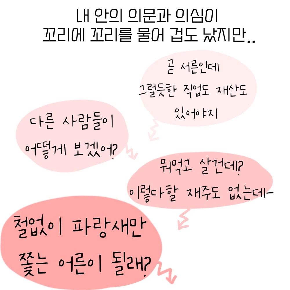 그때 당시 나는 소확행,소소하지만 확실한 행복을 누리는게 답이라고 생각했다. 왜냐하면 흔히 듣던 말들은 파랑새는 어디에도 없다, 현실에 만족할 수 있어야 하며 행복은 지금 여기에 있으니 소확행을 누려라, 하는 것이었으니까.