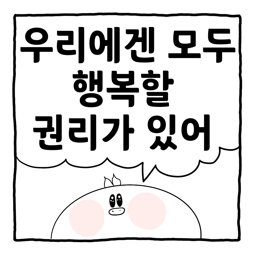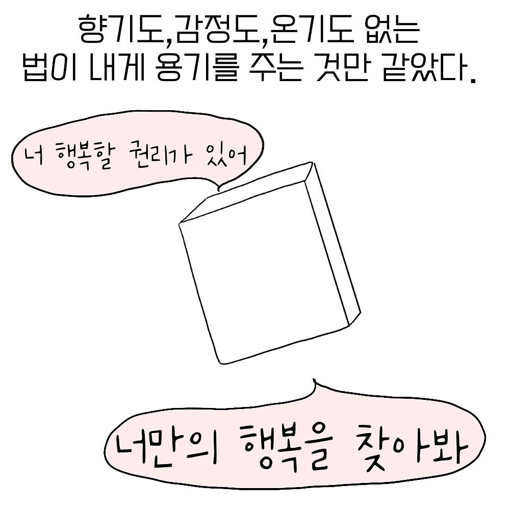 나는 그 ‘행복추구권’에 대한 조항을 오래도록 들여다보았다. 그러니까, 모든 국민은 행복을 추구할 수 있다는게 헌법에 나와있단 말이지. 그걸 행복추구권이라고 부른단 말이지. 물론 작가는 모두의 공존과 사회의 역할을 말하기 위해 법을 이야기했지만, 내게는 사뭇 새롭게 느껴졌다. 냄새도, 감정도, 색깔도 온기도 없는 법이, 마치 내게 용기를 주는 것만 같았다.