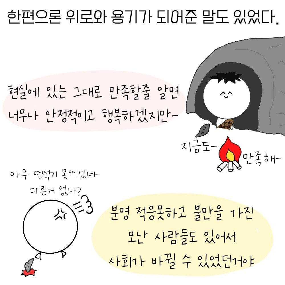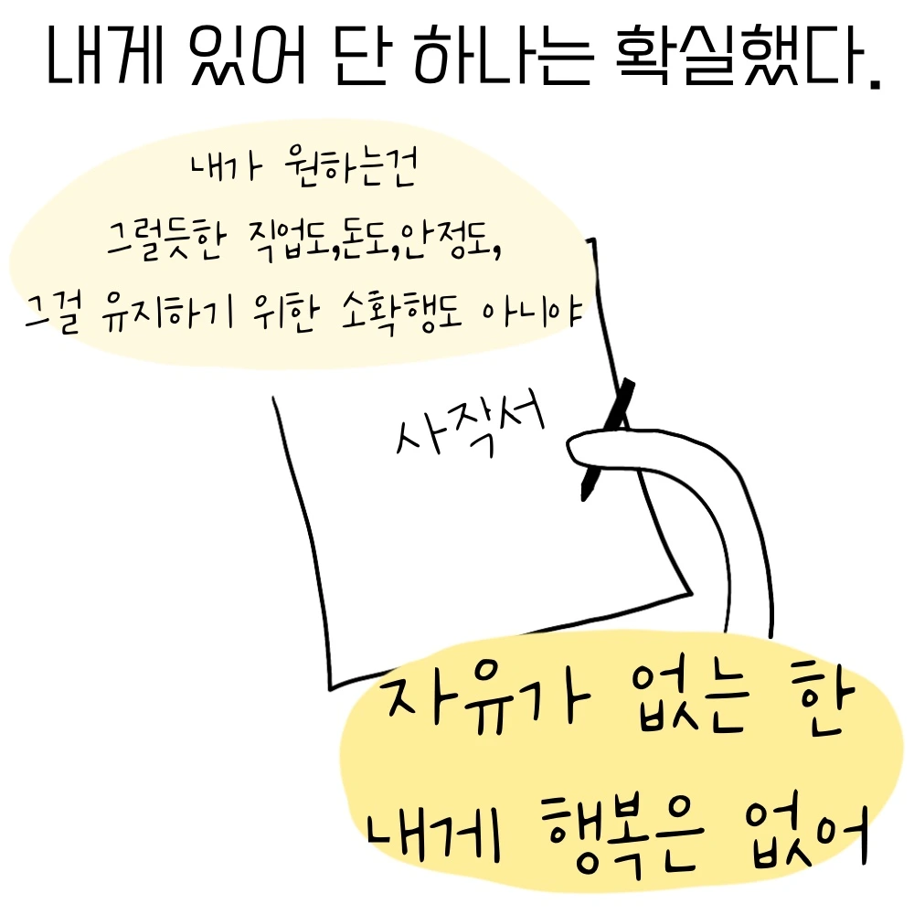 그렇게 다짐하고 보니 나는 지금 현실에선 행복할 수 없다는 판단이 내려졌다. 나에게 행복이란 곧 자유였기 때문이다. 그렇기에 갖은 방법으로 소확행을 누리며 현실에 만족해보려던 시도들이 모두 실패했었다는걸 깨달았다. 이젠 현실을 바꿔야할때가 왔다는 생각이 들었다. 어디선가 본 말도 내게 하나의 위로이자 이유가 되어주었다. 인류 전부가 현실에 있는 그대로 만족했다면 인류는 아직도 동굴에 살며 뗀석기를 쓰고 살았을지도 모른단 말. 현실에 불만을 가지고 더 나은 상황을 누리려던 사람들이 발버둥을 쳤기 때문에 사회가 조금 더 발전할 수 있었을 것이라는,현실에 만족하는 것만이 답은 아니라는.