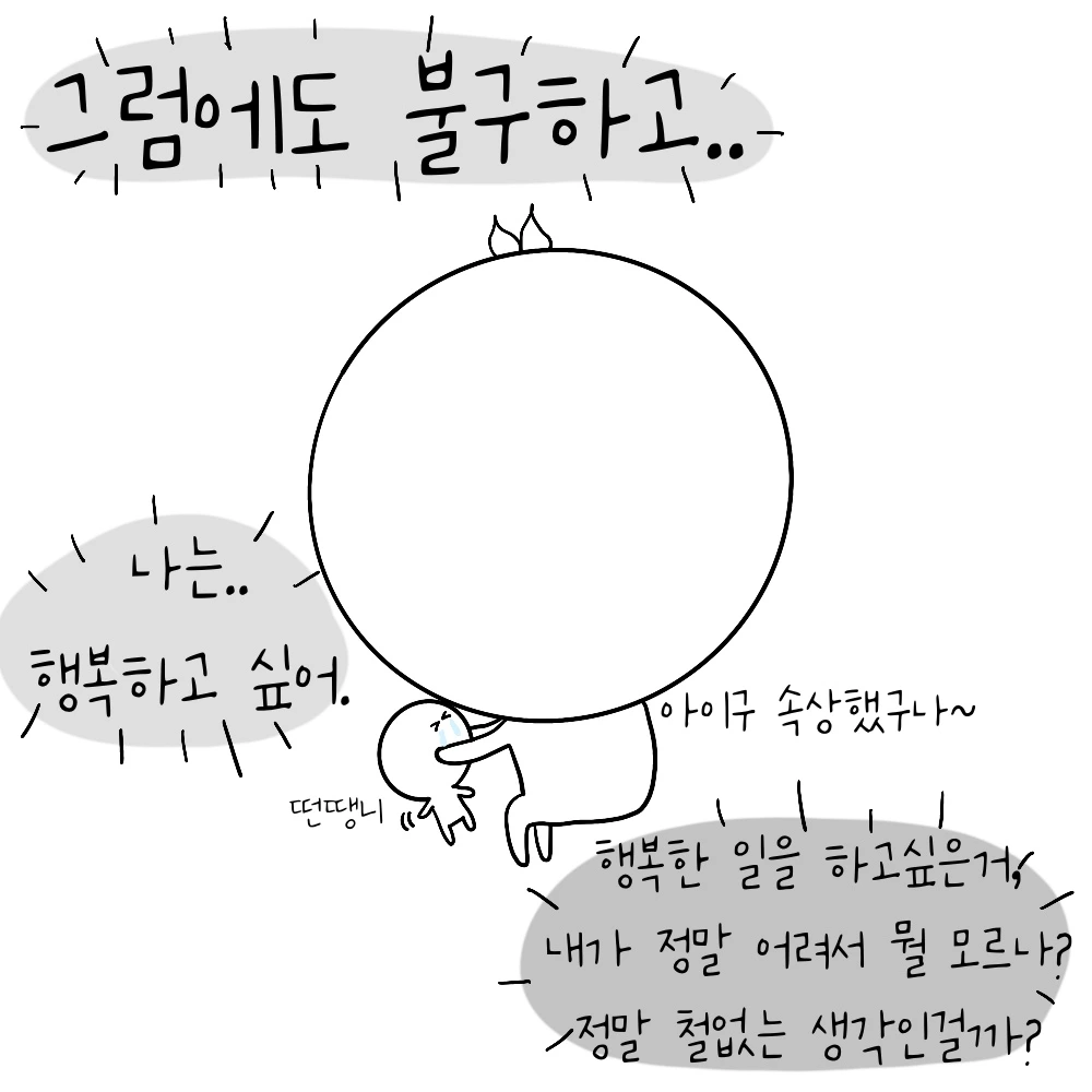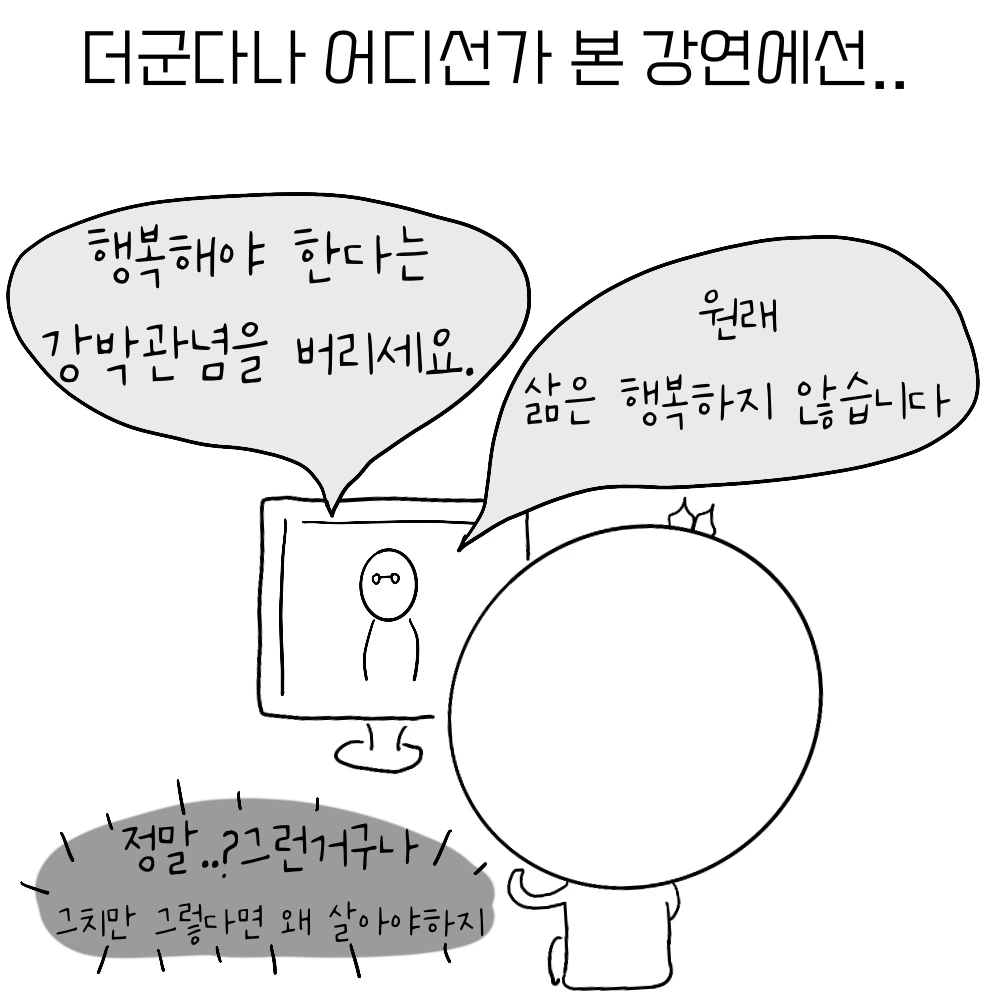 그리고 어느 날 유튜브에서 누군가가 행복에 대해 이야기한 영상을 보게되었다. 행복해야한다는 관념을 버리라고, 원래 인생은 고통일뿐이라는 이야기를 보게되었다. 나는 그때 체념하게 되었다. 그래, 행복해야한다는 생각때문에 힘들었나봐. 인생은 원래 고통이구나.
