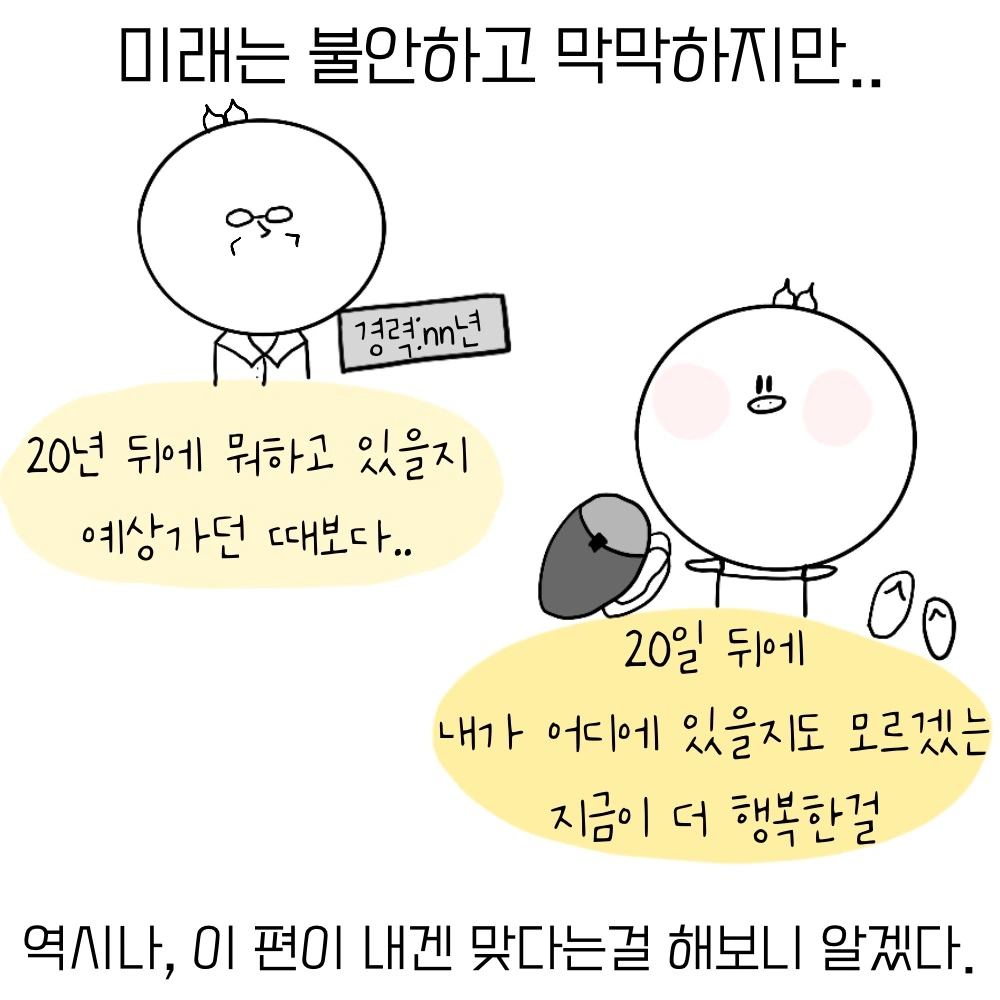 신기하게도 나는 20년 뒤도 알것 같던 교사시절보다, 20일 뒤 내가 어디에 있을지도 모르겠는 지금이 더 좋다. 아직 잘 모르겠다. 내가 가고 있는 길이 옳은지. 하지만 그 누가 판단할수 있을까?