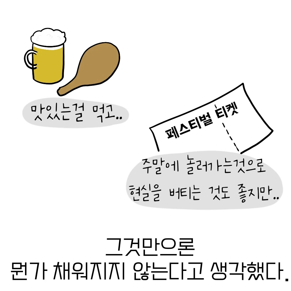 물론 일리가 있는 말이기도 하지만 그때의 나는 현실에 만족은 커녕 적응조차 하지 못하는것 같았다. 소확행은 단지 고통스러운 현실을 버티게 해주는 진통제같은 것이었다. 매일 맵고짜고단음식을 찾고, 공허한 마음으로 필요없는 자잘한 물건을 사기도 했으며, 놀러나갈곳을 찾거나 술을 진창 마시기도 했다. 책도 읽어보고 취미도 가져보았으며 종교도 가지고 기도도 했다. 진통제의 효과는 찰나였다. 나는 매일 매순간 더이상 이렇게 살수는 없다고 생각했지만 어딜가나 그런 이야기들이 들려왔다.