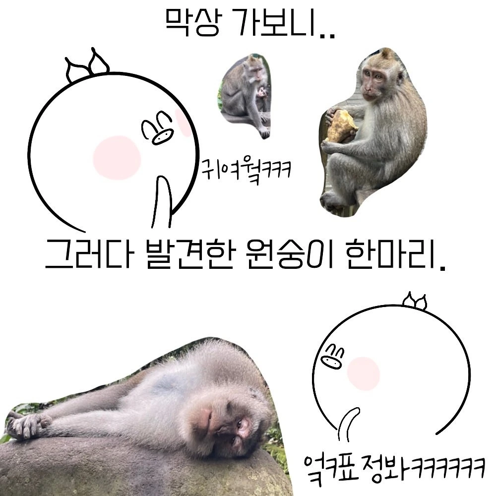 얼마 전 우붓의 원숭이숲에 구경을 갔다. 이곳의 원숭이숲은 원숭이들의 집단 서식지로, 숲에 들어가면 자유롭게 나무사이를 돌아다니는 원숭이들을 구경할 수 있다.