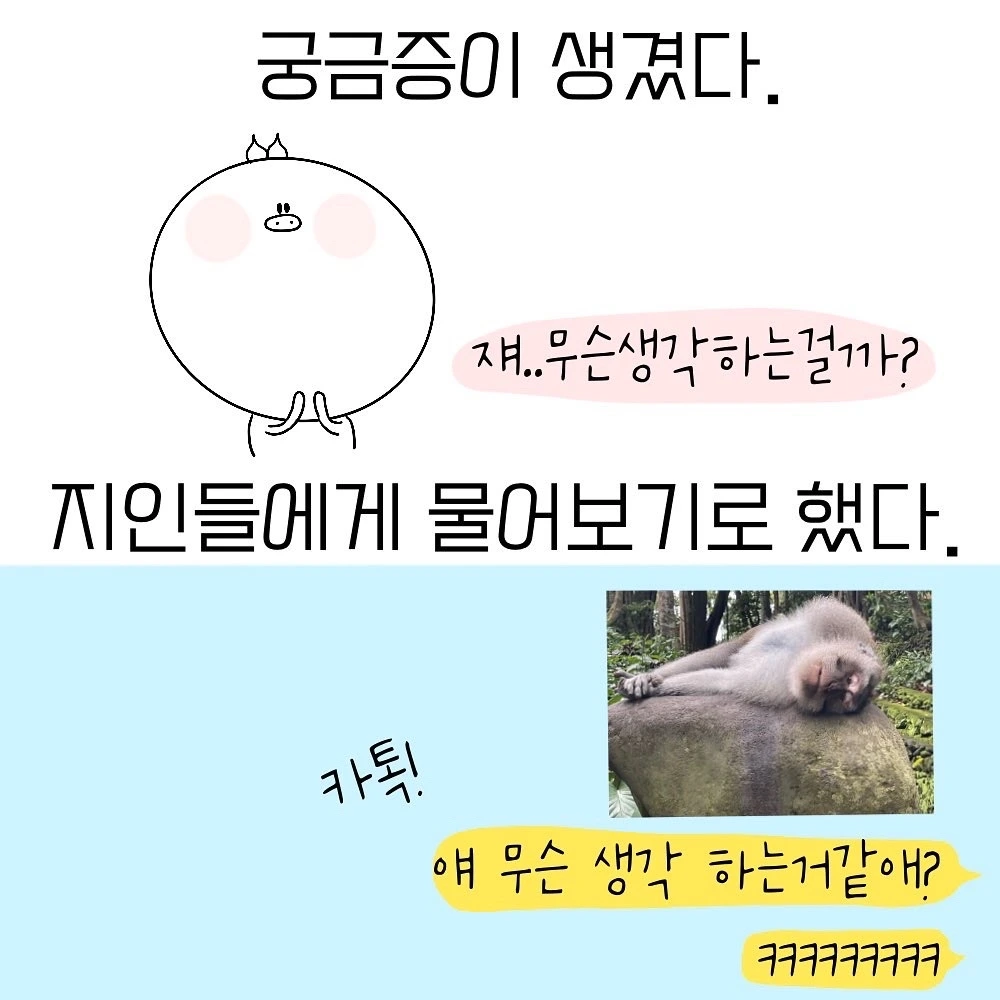 그러다 발견한 웃긴 자세의 원숭이들이 있으면 지인들에게도 보내주었다. 성격과 관심사에 따라 달라지는 의견들이 흥미롭다. 작은 지구별의 비슷비슷하게 생긴 사람들이지만 어찌나 모두 다 다르고 다양한지.