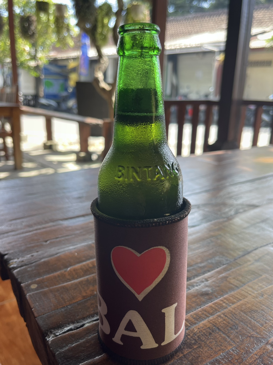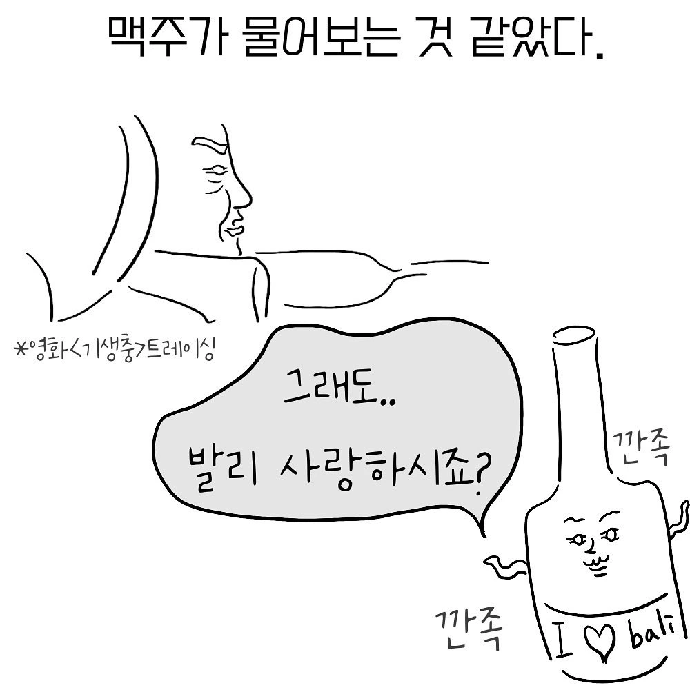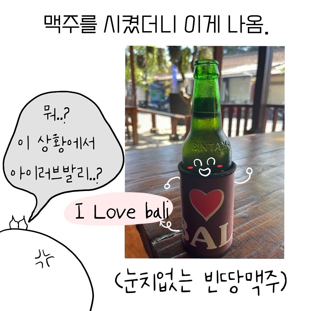 그렇게 5시간이 지나자 나는 다시 배를 탔었던 빠둥바이에 내리고 있었다. 멍한 표정의 나를 보며 직원들이 하하 웃었다. 내 속도 모르고, 직원들은 ‘너 잠들었구나? 하하 우리 오늘 이제 배없어~’ 라며 웃어댔다. 나도모르게 나온 나지막히 읊조리는 욕 한마디에 옆에 서있던 직원은 보트가 또 있다며 나를 어디론가 데려가더니 12만원을 주면 7시간이 걸리는 보트를 태워주겠단다. 나는 정말이지 아무것도 하기 싫어졌다. 얼마간의 실랑이 끝에 돌아오는 표까지 환불받은 후, 나는 보이는 아무 식당에나 들어가 앉아 피자와 빈땅맥주를 시켰다. 눈치없게도 빈땅맥주커버에 ‘I love bali’라고 써있다. <기생충>의 명대사가 생각났다. 맥주가 나에게 이렇게 묻고 있는 것만 같다.