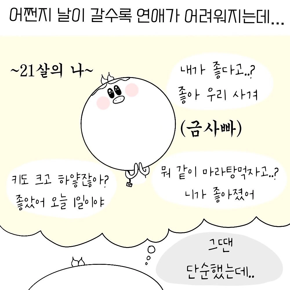 지금의 나는 20살의 나에 비해 점점 나 자신이 어떤 사람인지 알아가고 있다. 누군가를 만나 대화해보면, 외모나 한두가지 매력포인트만 봤던 예전과는 달리 어떤 점이 나와 맞고 안맞을지 이제는 알것도 같다. 모든걸 떠나 좋아하는 마음만 있으면 그 나머진 어떻게든 된다는 생각을 했던 적도 있지만, 좋아하는 마음만으로는 쉽지않은 것이 연애라는 것도 알아버렸다. 몇차례의 만남과 이별로 인해 연애의 반복되는 과정들 또한 조금은 알것같고, 그걸 다시 반복한다고 생각하니 생활에 치여 그럴 에너지조차 별로 남아있지 않다.
