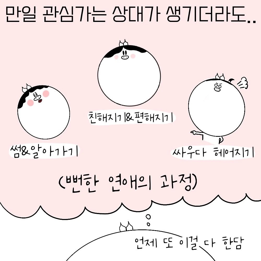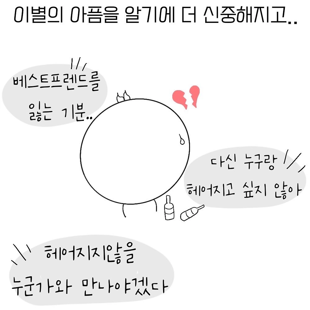 그 모든 것들 중 가장 두려운 것은 다름아닌 이별이다. 연애를 하다 헤어지면 남이 되어야 한다는 건 정말이지 슬픈 일이다. 인생의 어느 시기에서 모든걸 공유했던, 가장 친했던 한 사람과의 추억과 감정이 통째로 사라지는 그 경험. 베스트프렌드 한명을 잃는 것 같은 그 허전함! 전 연인과의 사진들을 지우다보면 그 시기의 앨범은 어쩐지 텅 비어보인다. 그 빈자리를 겪어내는 일을 더이상 반복하고 싶지 않다. 그래서 애초에 헤어지지않을 사람과 만나고 싶다고 생각하니 점점 연애는 멀어져만 간다.