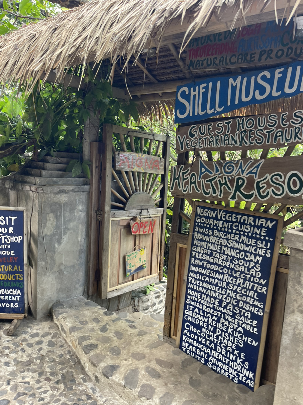 발리의 조용한 해안가 지역인 아메드를 여행하던 중이었다. 며칠간을 눈뜨자마자 이곳저곳의 바다를 찾아다니며 스노쿨링을 하고 바이크를 타고 오가던 중 발견한 곳은 Aiona Garden Of Health. ‘아이요나의 건강한 정원’이라니. 영화제목도 이보다 평화로울수 없다. 자세히 들여다보니 이 곳에서는 요가클래스와 조개박물관을 운영하고, 건강식을 파는 식당과 게스트하우스를 운영한다고 써있다. 호기심에 요가를 배워봐야겠다며 곧장 문을 열고 들어가니 푸릇푸릇한 정원을 따라 작은 길이 나있다.