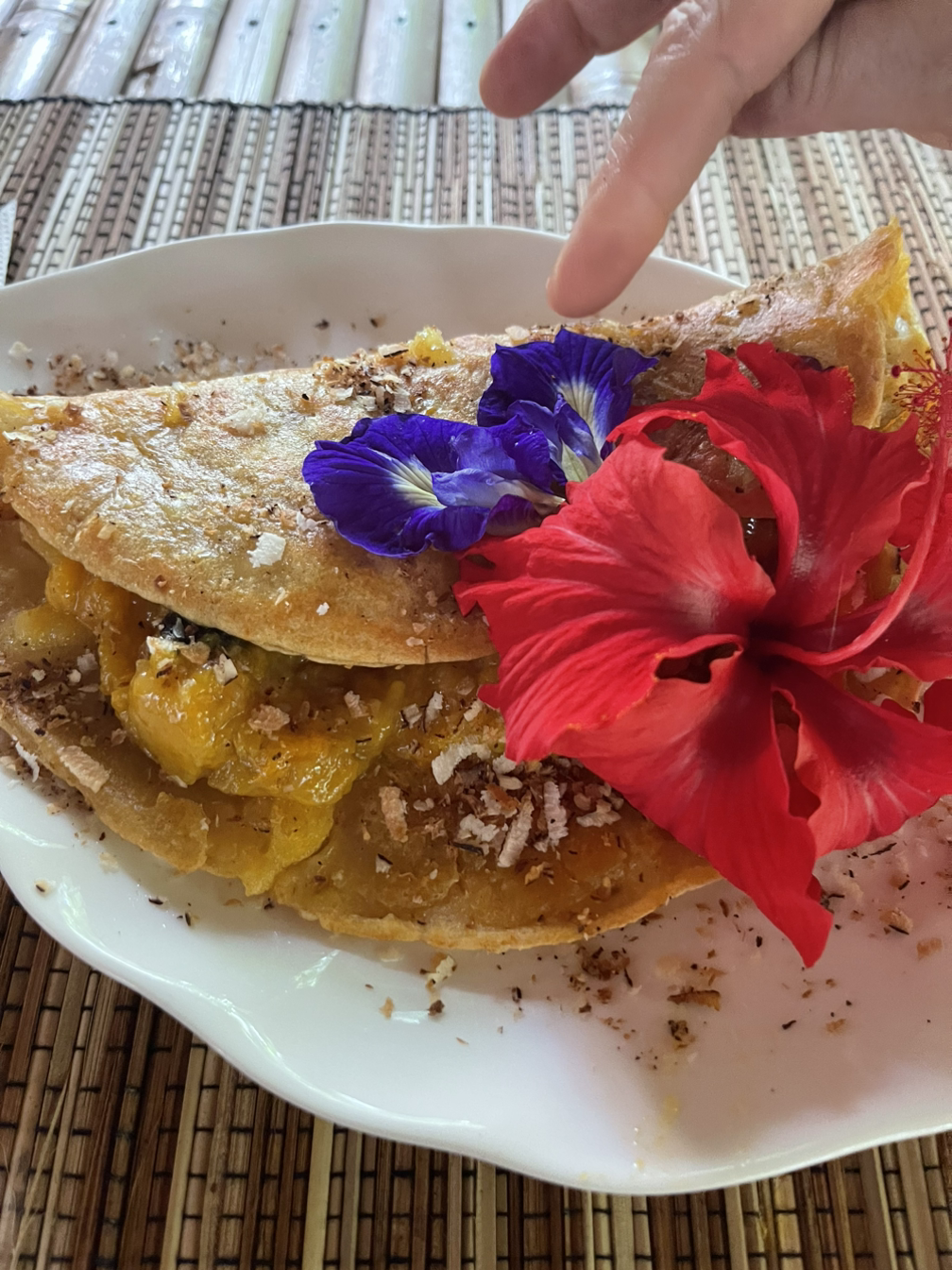 수업이 끝나고는 팬케이크와 망고주스를 시켰다. 선생님은 직접 요리한 팬케잌을 내어다주며 꽃도 먹을 수 있는 꽃이고, 망고주스는 정원의 망고나무에서 망고를 따서 만들었다고 했다. 정원에 앉아 싱싱한 향이 나는 망고주스를 한모금 들이키자니 마음이 착 가라앉아 잔잔한 물결처럼 느껴졌다. 이런 정원을 하나 만들어 요가를 가르치며 살면 소원이 없겠다는 생각이 들었다. 언젠간 꼭 그러리라고 다짐하며 팬케잌 한조각을 입에 넣었다.