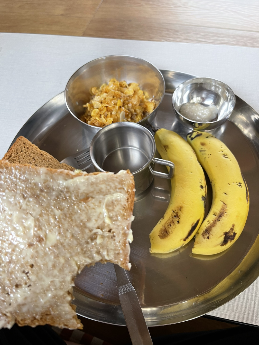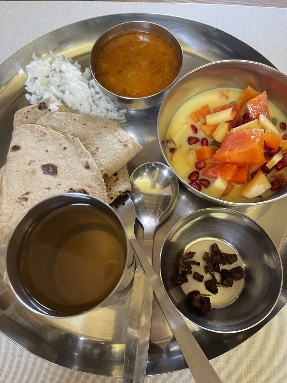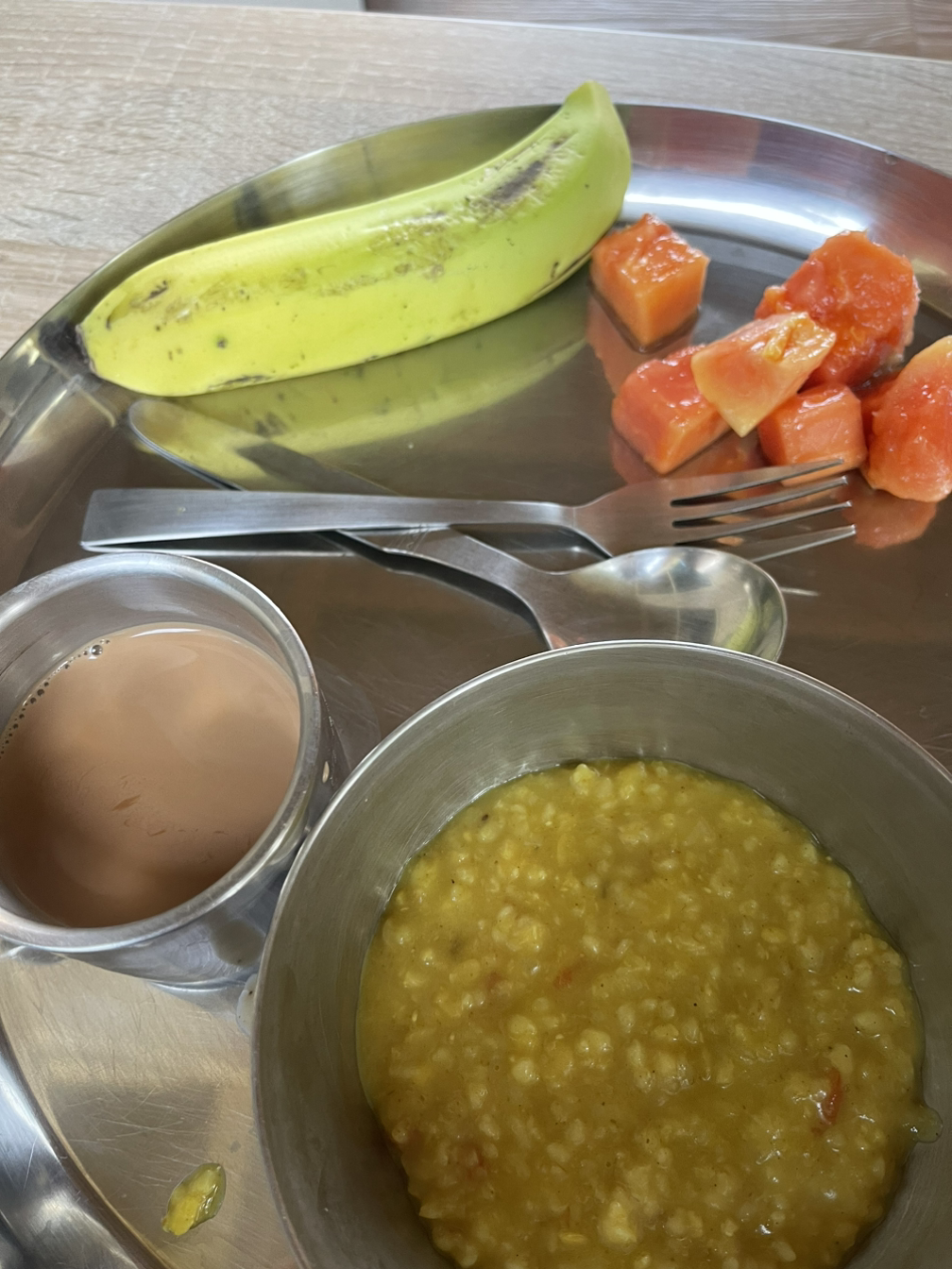 요가원에 오고 가장 일상과 달라진 점은 다름아닌 먹거리였다. 요가원에서는 계란조차 먹지 않는 완전비건식단을 고수하고 있었는데, 아침식사는 보통 바나나와 파파야 등의 과일과 토스트, 콘프레이크 등이 나왔고 점심과 저녁식사로는 카레와 짜파티 같은 음식들이 나왔다.