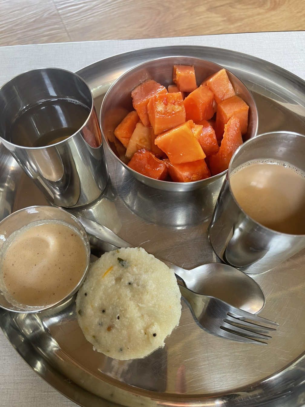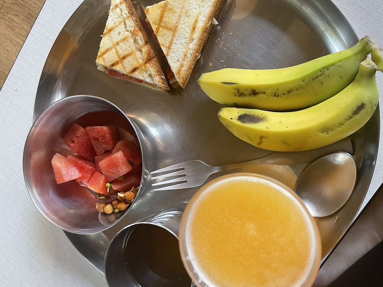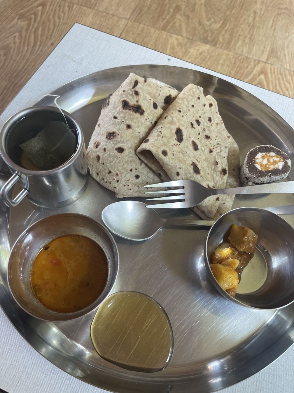 요가원에 오고 가장 일상과 달라진 점은 다름아닌 먹거리였다. 요가원에서는 계란조차 먹지 않는 완전비건식단을 고수하고 있었는데, 아침식사는 보통 바나나와 파파야 등의 과일과 토스트, 콘프레이크 등이 나왔고 점심과 저녁식사로는 카레와 짜파티 같은 음식들이 나왔다.