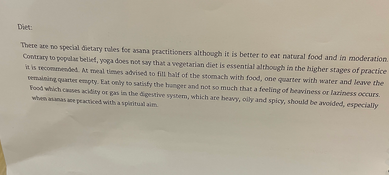 요가 이론 책에는 식사를 할 때의 몇가지 지향점이 적혀있었는데, 위의 1/4은 물로 채우고, 1/4는 비워두며 나머지 1/2만 음식물로 채우는 것이 가장 이상적이라고 했다. 굶주림을 채울정도로만 먹되, 무겁거나 게으름이 느껴질 정도로 먹는 것은 피해야한다고 했다.
