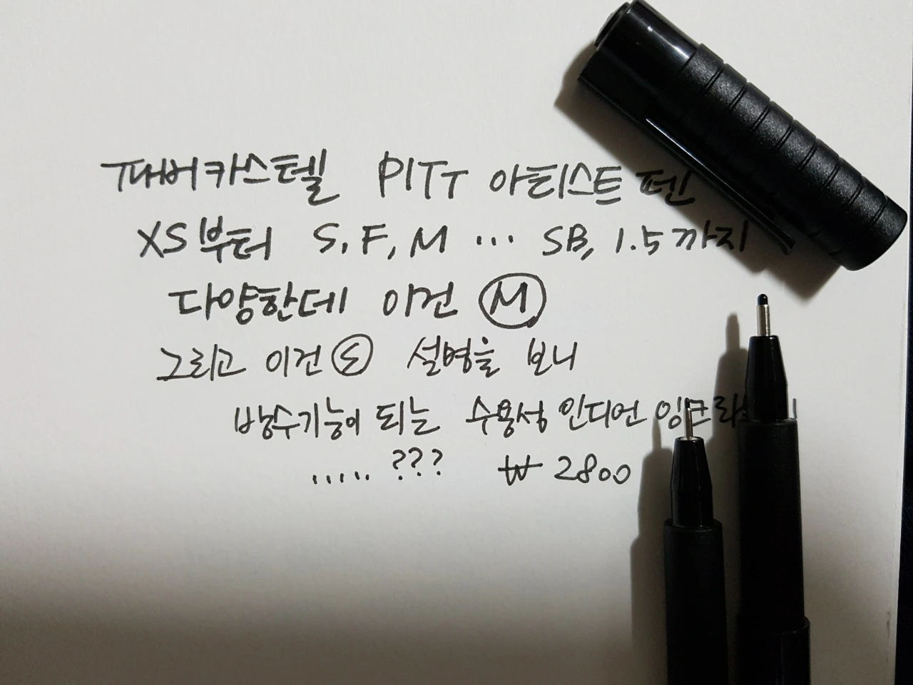 이제 파버카스텔 PITT 아티스트 펜이다. XS부터 S, F, M을 넘어 쭉쭉 가다가 SB, 1.5까지 다양한 굵기의 제품을 내놓는데 내가 산 건 M과 S이다. 설명을 보니 방수 기능이 되는 수용성 인디언 잉크를 썼다고 하는데 방수 기능이 되는 수용성 잉크...? 방수... 수용성...?......??? 가격은 2800원 선.