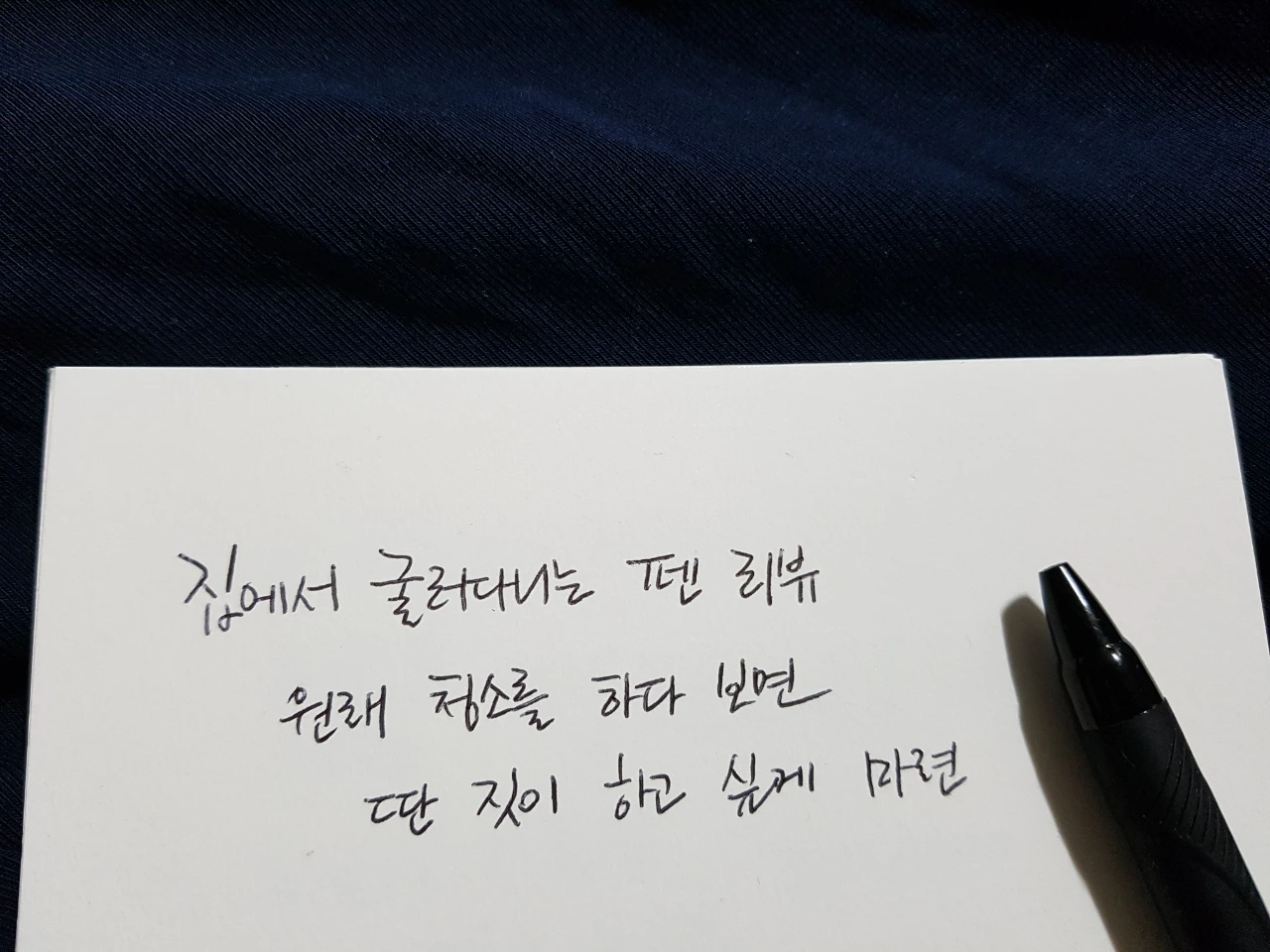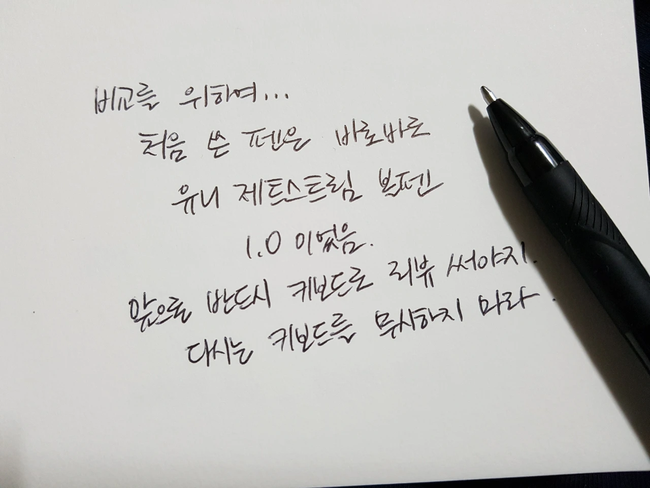 ...... 이렇게 하고 안녕하면 좀 무책임한 것 같다는 생각이 들었다. 리뷰를 봐서 알겠지만 펜이 거기서 거기다. 비슷한 가격대에 비슷한 느낌이다. 모두 그림 그릴 때 선 따려고 샀던 제품들이라 그렇다. 하지만 이렇게 비교해 주는 리뷰를 찾지 못해서 없으면 내가 만든다는 심정으로 적어 보았다. 그러니 비교 대상도 있어야지. 원래 국민 볼펜 모나미 153 볼펜을 찾으려 했으나 모나미도 약에 쓰려면 없네. 아마 리뷰 다 쓰고 올리고 나면 방구석에서 나올 것이다. 이것은 어쩌면 모나미 볼펜을 찾기 위한 일종의 의식인지도. 그래서 꽤 흔한 편인 유니 제트스트림 볼펜으로 글씨를 써 보았다. 포토샵을 하지 않은 상태이니 이 사진을 기준으로 마음에 드는 펜을 찾아보는 것도 나쁘지 않을 것이다. 그리고 앞으로는 반드시 키보드로 리뷰 써야지. 다시는 키보드를 무시하지 마라. 너 때문에 손목이 다 나갔으니까 책임져. 예, 알겠습니다! 키보드소스님!