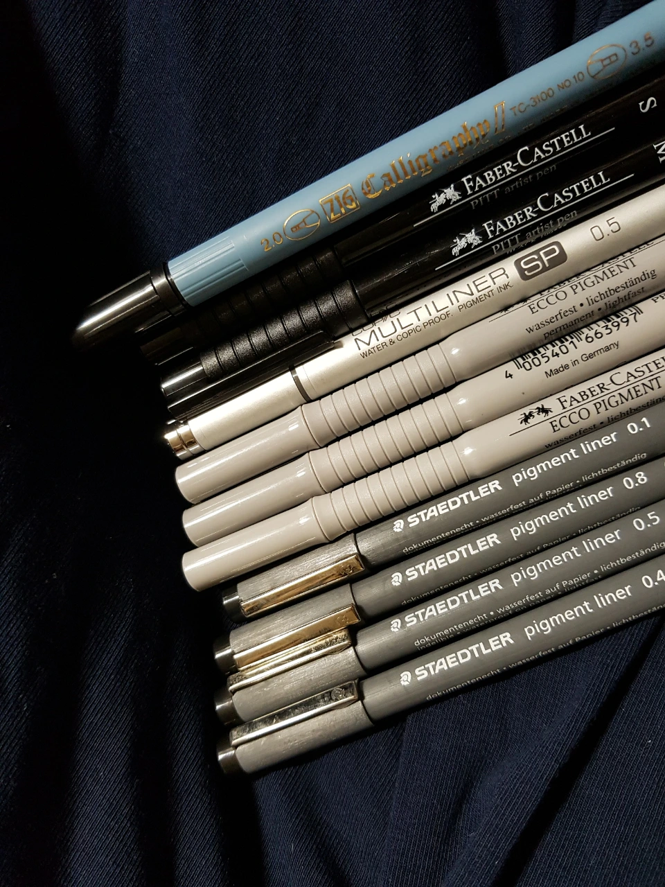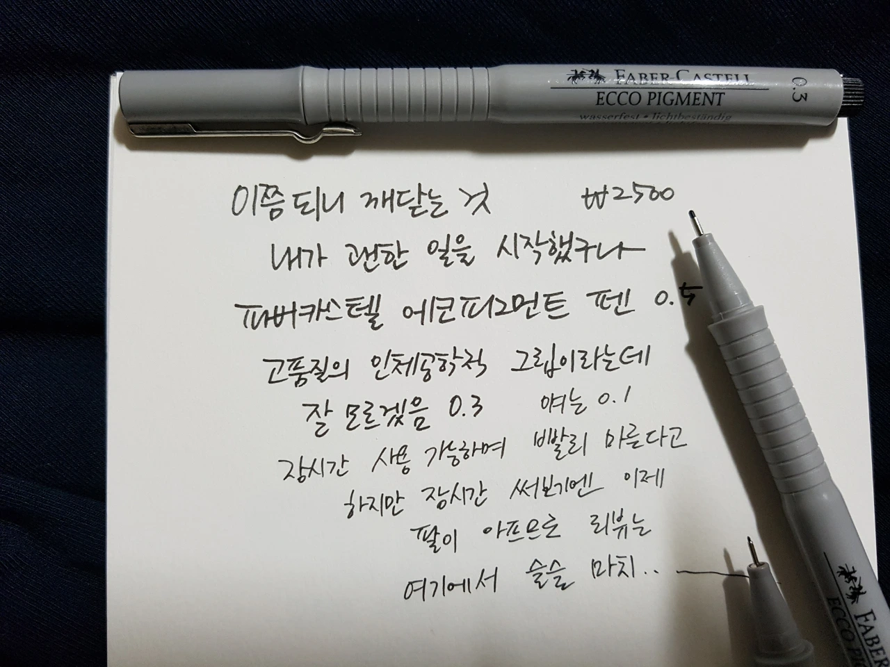 사실 이쯤 되니 깨닫는 것이라고 적었으나 이미 한참 전에 깨달았다. 내가 괜한 일을 시작했구나. 손가락이 너무 아파. 그래도 리뷰한다. 으으 노장 투혼. 파버카스텔 에코 피그먼트 펜. 0.5짜리는 팁이 단단하고 0.3과 0.1은 꾹 누르면 들어갈 것처럼 무르다. 고품질의 인체공학적 그립이라는데 잘 모르겠고 손이 아프다. 장시간 사용 가능하고 빨리 마른다는데 장시간 써보기에는 이제 내 팔이 노익장을 과시하기에도 지친 것 같다. 팔이 아프므로 리뷰는 여기에서 슬슬 마치............