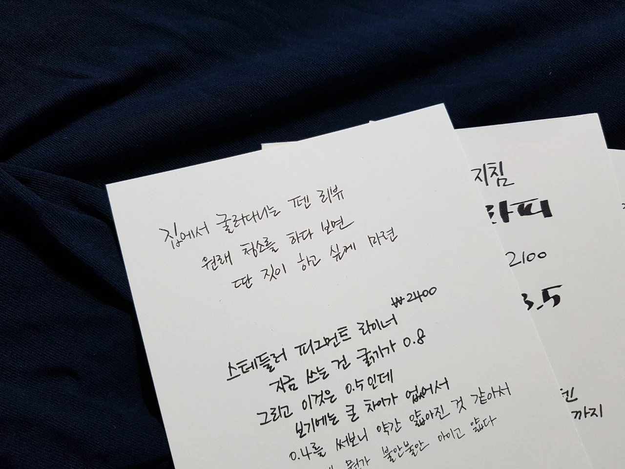 오늘의 리뷰 대상. 스테들러 피그먼트 라이너, 코픽 멀티 라이너 SP, 지그 캘리그래피 트윈팁, 파버카스텔 PITT 아티스트 펜, 파버카스텔 에코 피그먼트 펜. 기준은 없다. 마치 정부 정책처럼. 단지 서랍 정리를 하는데 들어 있었다. 평생 다 쓰지도 못할 텐데 모으기는 엄청나게 모아댄다. 그래놓고 정작 필요할 때 없어서 다시 산다. 예전에 조석 작가의 웹툰 '마음의 소리'를 보다가 컴퓨터가 고장 나서 손으로 그린 편을 보고 큰 감동을 받았다. 그래서 펜 리뷰니까 펜으로 직접 써보기로 했다. 일종의 오마쥬. 그리고 몇 줄 쓰지 않아 깨달았다. 내가 큰 실수를 했구나.