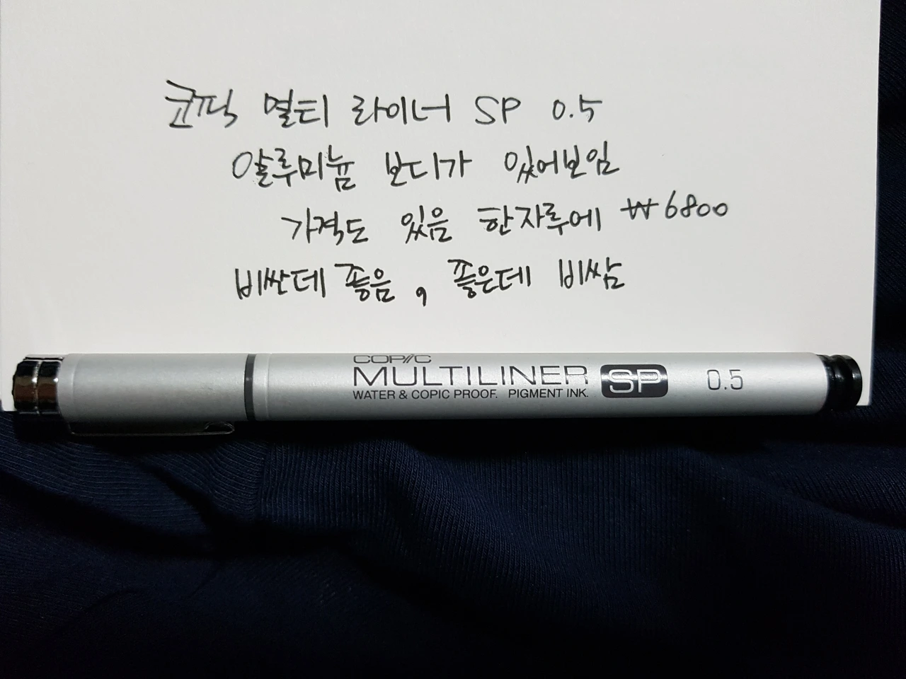 이것은 코픽 멀티 라이너 SP 0.5다. 그림 좀 그린다 하는 이들 사이에서는 잘 알려진 펜. 선 따기에 좋은 펜으로 알려져 있다. 한 자루만 있는 이유는 비싸서. 알루미늄 보디가 있어 보인다. 겨울에 쥐고 있으면 차갑다. 가격도 있어 보인다. 한 자루에 6800원 선. 물론 더 싸게 살 수 있지만 오늘 리뷰하는 펜들 중에 가장 비싸다. 거의 두배에서 세배 가까이 가격 차이가 난다. 비싼데 좋다. 좋은데 비싸다.