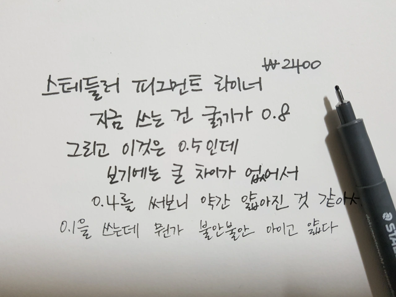 먼저 스테들러 피그먼트 라이너. 0.8과 0.5는 육안으로는 큰 차이가 없다. 팁이 단단한 것이 특징. 0.4부터 아 조금 얇아졌구나 하는 생각이 든다. 0.1을 쓰다 보면 과거 파이롯트 하이테크 펜 쓰던 시절의 향수가 자극되며 불안 불안하고 금방이라도 심이 들어가서 망할 것 같은 느낌이 든다. 원래 그림 그리려고 산 거였기에 글씨 쓸 거였으면 0.1은 안 샀을 것이다. 가격은 2400원 선.