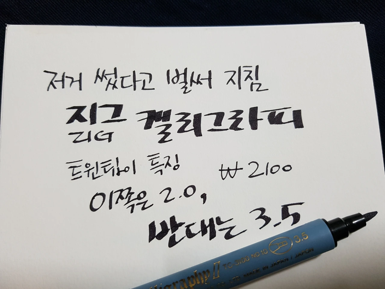 저거 썼다고 벌써 지친다. 손가락이 아프다. 글씨도 예쁘게 안 써졌는데 다시 쓸 엄두가 나지 않으니 얼른 지그 캘리그래피 펜으로 넘어가 본다. 트윈팁이 특징이다. 한쪽은 2.0, 한쪽은 3.5. 하지만 어쩐지 3.5 굵기인 쪽은 잘 쓰지 않게 된다. 내가 능숙하지 않아서 예쁘게 안 써져서인지도 몰라. 결국 2.0인 쪽만 쓰고 있는데 이건 뭐 트윈팁인 제품을 산 의미가 없잖여. 가격은 2100원 선.