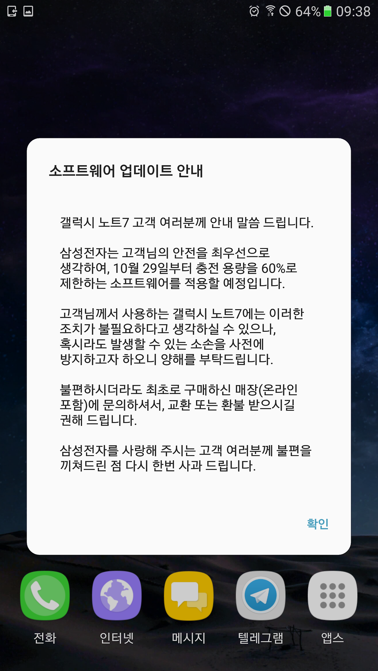 언제나 중요 공지는 나를 설레게 한다. 그러나 이번만큼은 아니었다. 내가 바로 그 삼성이 스마트폰을 만들랬더니 스마트 웨폰으로 만들어버린, 시한폭탄 삼성전자 갤럭시 노트7을 쓰고 있는 이용자, 아직도 갤럭시 노트7을 교환, 환불하지 않는 이용자가 수십만에 달한다고 연일 언론에서 때려대던 바로 그 이용자였기 때문이다.