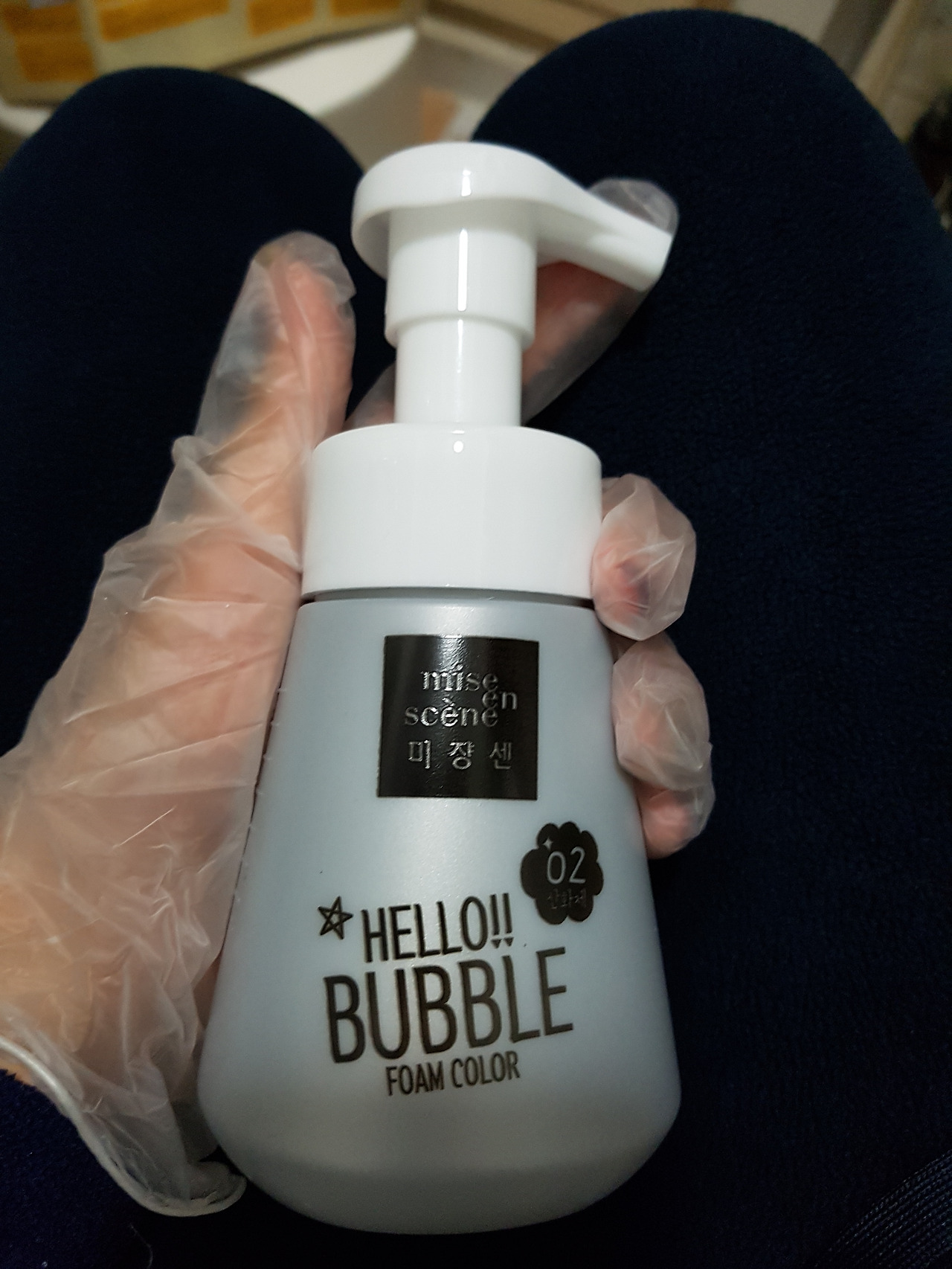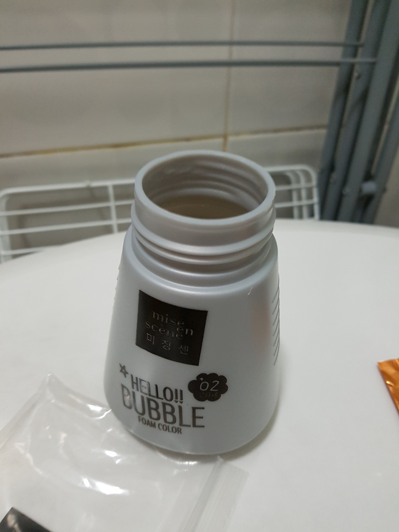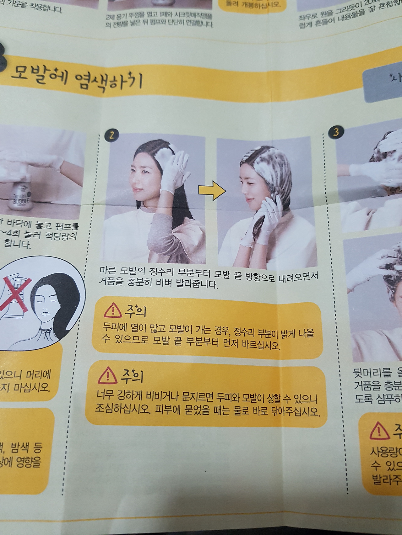 폼 클렌저 같이 생긴 염색 약통을 밑에 뭐가 묻어도 지장이 없거나 어머니께 등짝이 맞지 않을 곳에 놓고 작업하도록 하자. 괜히 하얀 양변기나 목욕 의자 위에 올려놓고 했다가 나중에 거기도 무료로 염색이 되는 신나는 사태가 발생할 수 있기 때문. 특히나 진한 색이라 대충 흘려버렸다가 타일 사이사이가 검게 염색된 꼴을 보고 싶지 않다면 주의 또 주의.