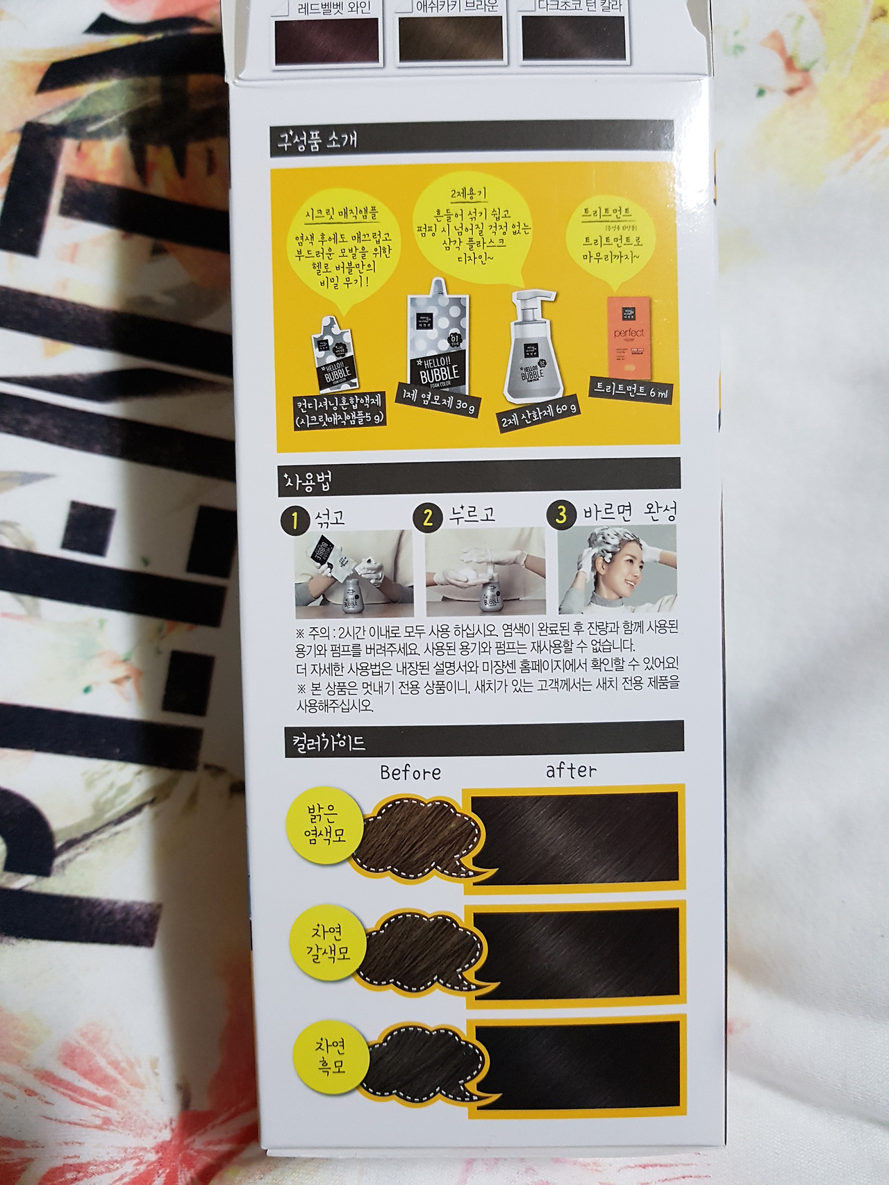 한국인이 참으로 설명서 안 읽기로 유명한 민족인데 나는 별종이라 설명서는 되게 자세히 읽는다. 그리고는 안전을 위한 패치 테스트는 한 번도 하지 않았다. 뭔가 말 잘 듣는 반항아의 느낌. 그렇지만 이건 내 피부가 무쇠로 만들어져서 가능한 일일 것이고 시간 여유가 있다면 안 보이는 부분에 패치 테스트를 해보고 문제없을 때 염색을 진행하길 바란다. 예전에 미용실 선생님 왈 버블 염색이 냄새만 심하지 않을 뿐 모발에는 되게 좋지 않다는 열변을 토했던 게 생각나서 참고로 적어본다. 이쪽엔 문외한이라 그게 미용실 특유의 우리 집 와서 염색하라는 상술인지 정말 그런 것인지는 모르겠다.