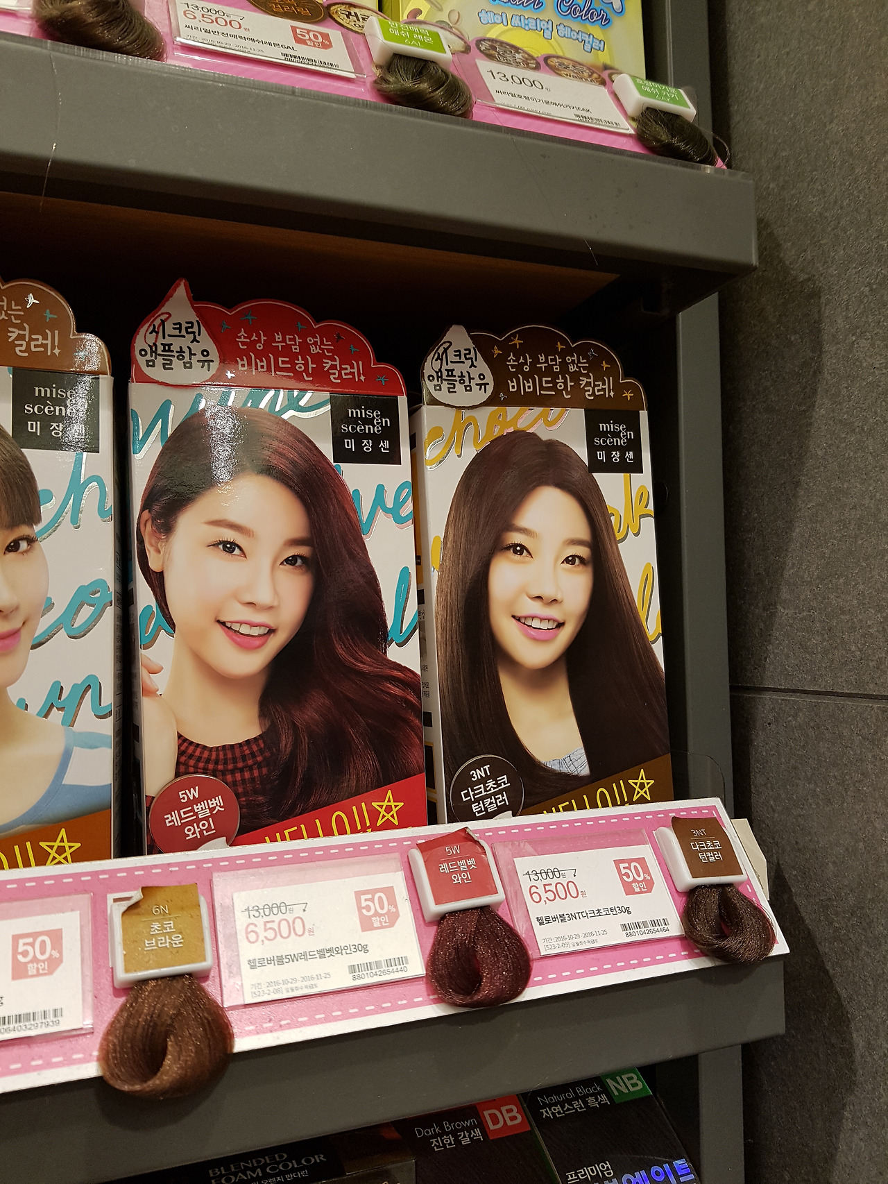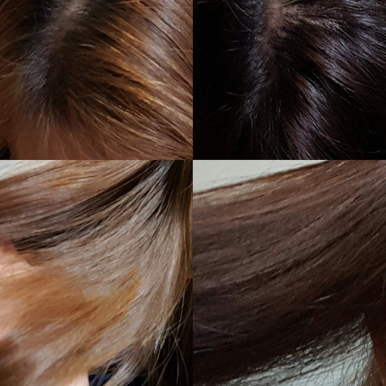 비교를 위한 정수리와 옆머리. 왼쪽이 염색 전이고 오른쪽이 염색 후다. 스마트폰으로 찍은 무보정 사진이라 최종 머리색은 오른쪽 사진의 평균치 정도, 고동색으로 나왔다고 보면 맞다. 보통은 이런 염색약 후기하면 스스럼없이 얼굴 샷도 뿌잉뿌잉 올리고 하던데 난 스스럼 있으니까. 어차피 중요한 건 내 얼굴이 아니라 머리털 색 변화가 아닌가. 6500원에 이 정도면 성공. 스타벅스에서 2017 다이어리를 받기 위해 마셔야 할 시즌 음료 이를테면 토피넛 라테 그란데나 벤티 사이즈 한 잔 정도 값으로 헤어 체인지도 하고 기분 체인지도 할 수 있었다. 기장은 어깨선을 조금 넘는 정도였는데 한통으로도 충분했다. 괜히 두 통 샀다. 저건 대체 언제 쓰지. 중고나라에서 파는 사람도 있던데 직거래하는 시간과 정성을 생각하면 내가 마음이 변해 다시 탈색했다가 턴 컬러 하는 게 빠르겠다는 생각이 들었다. 이 컬러로 염색한 사람들 말이 10여 일 지나면 물이 조금 빠지면서 적갈색으로 된다고 하던데 그것도 나름대로 매력이 있을 것 같아 기대 중이다.