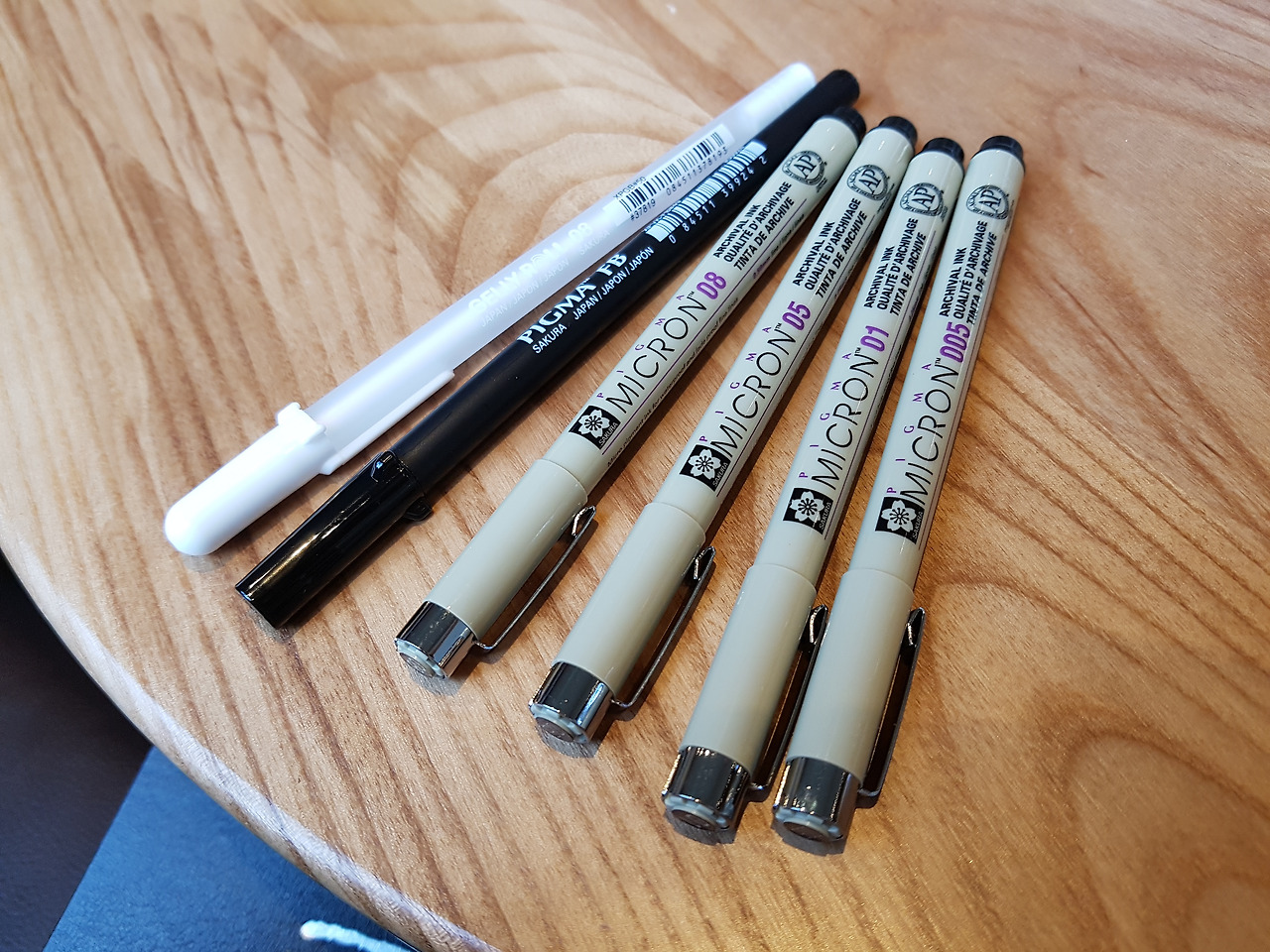 언제나 새 펜은 설렌다. 왼쪽부터 사쿠라 화이트 겔리롤, 피그마 브러시 펜 FB, 피그마 마이크론 08, 05, 01, 005.