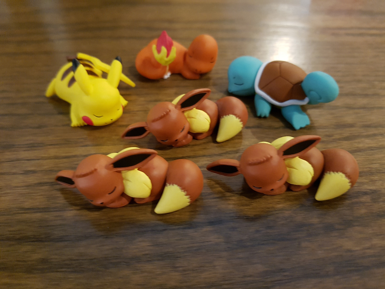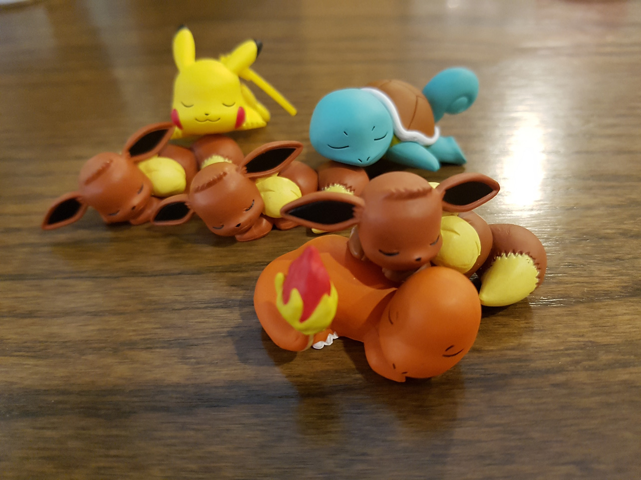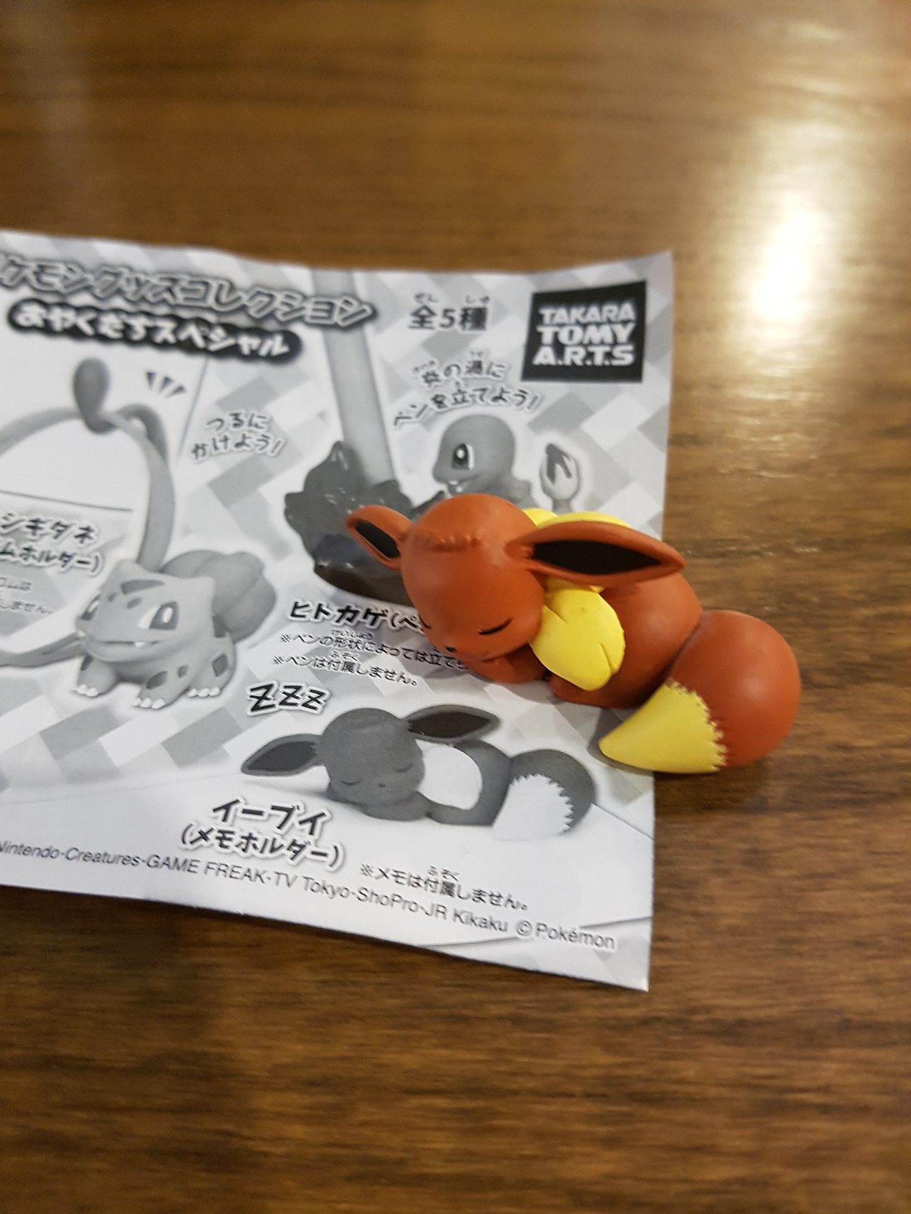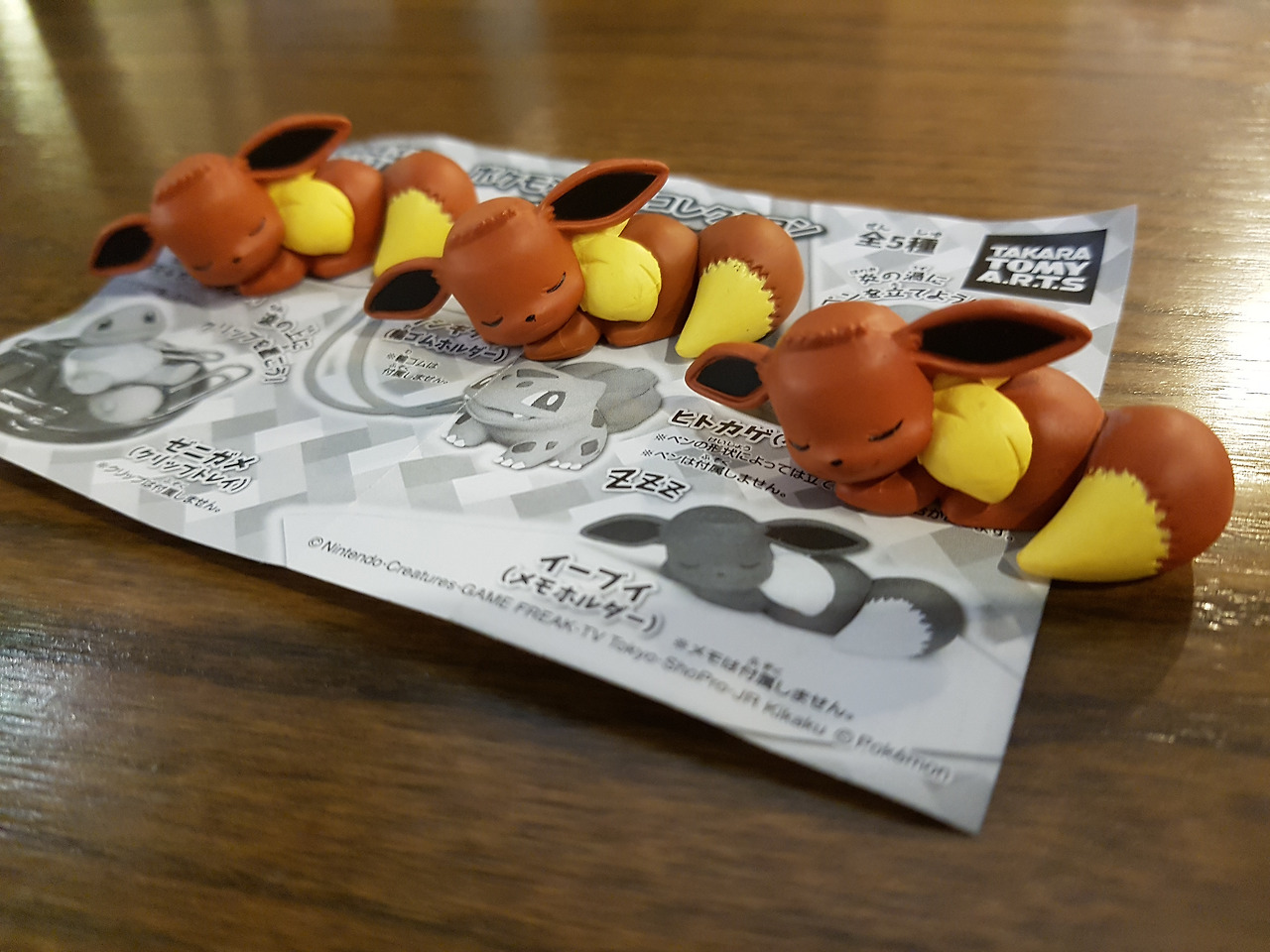 쓸모없는 잠자는 이브이 세 마리 득템. 메모지 홀더로 쓰라는데 그건 위의 포켓몬으로도 충분히 쓸 수 있다고. 너는 왜 잠꾸러기 포켓몬 시리즈에 들어있지 않고 여기 있는 거니. 길을 잃었니? 내가 게임이었으면 주저하지 않고 세 마리를 모았을 거다. 이브이는 각각 물 불 전기 속성으로 진화시킬 수 있거든*. 그런데 너희는 안되잖아? 이런 쓸모없이 귀엽기만 한 놈들...